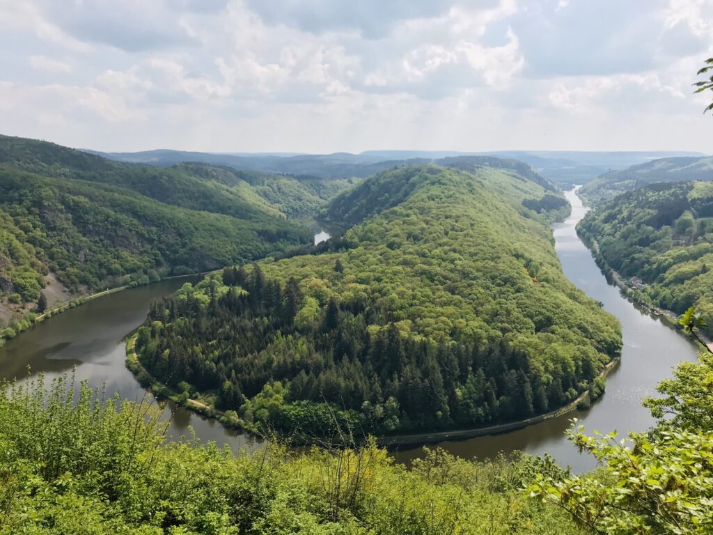 Nach einem Plausch mit den Gastgebern im Gästehaus Kerber in Merzig brechen wir zunächst ohne Gepäck zur Saarschleife auf. 11 km durch Merzig, Mettlach und entlang der Saar hinauf nach Orscholz für die Aussicht. Bei angenehmen 20 Grad stiefeln wir noch ca. 500 Meter zum Aussichtspunkt. Der Ausblick bei dem tollen Wetter ist ein Traum! Auf dem Rückweg bekommen wir noch einen ZDF Krimi-Dreh mit: dort liegt auf jeden Fall auch die Leiche…