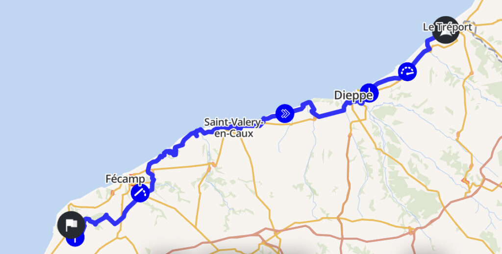 Wir planen die Fahrt entlang der Küste. Unterbrochen werden die Küstenabschnitte durch ein Atomkraftwerk (lassen wir aus) und danach die größere Stadt Dieppe (lassen wir auch aus, wir wollen mehr Meer).