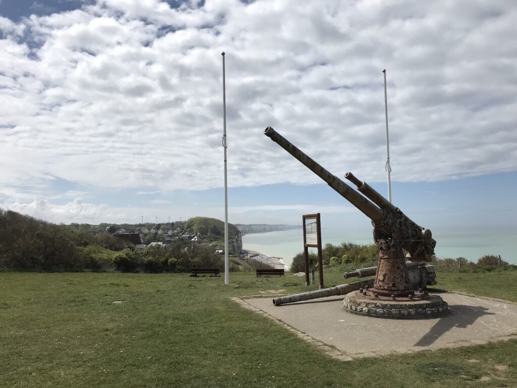 Kurz vor Veules-les-Rose halten wir bei einem Weltkriegsmahnmal. Es gibt einen herrlichen Ausblick auf die Küstenlinie und den Ort unterhalb der Klippen. Die Gedenkstätte ist dem Kriegsschiff Cerons und deren Besatzung gewidmtet. Beim Versuch alliierte Soldaten von Land zu retten ist das Schiff 1940 gesunken. Zwei Bordkanonen der Cerons befinden sich recht gut erhalten an Land beim Mahnmal und bei starker Ebbe sind Teile des Wracks unterhalb der Felsen zu sehen (haben wir nicht gesehen).