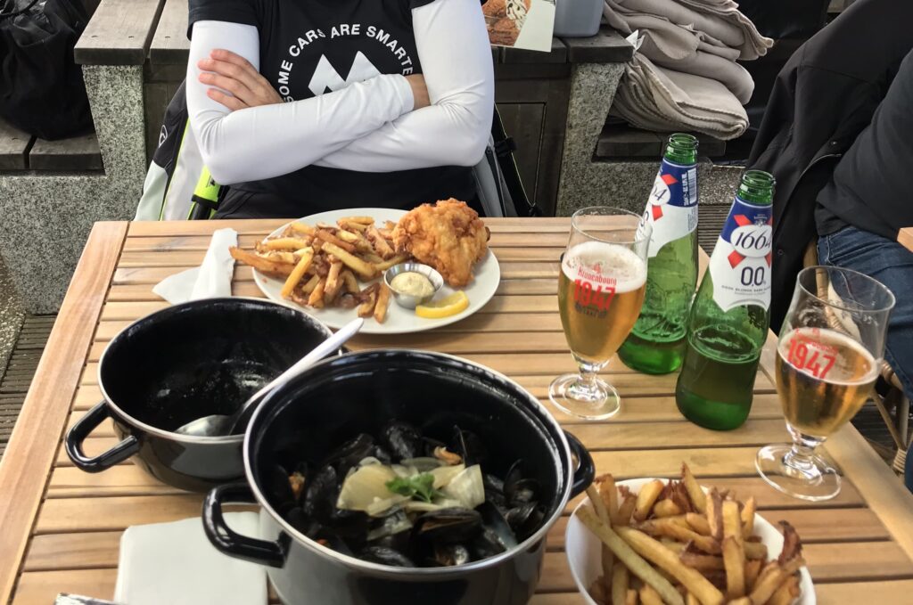 Kaum sind wir an der Küste in Sainte-Marguerite-sur-Mer, lacht uns passend zur Mittagszeit ein gut besuchter Strandimbiss an. Also Vollbremsung, Moppeds geparkt, raus aus dem Helm und nichts wie hin. Der überdachte Pavillon ist gut besucht und wir ergattern einen der letzten Tische. Die Speisekarte ist überschaubar: Es gibt Austern, Moules frites (Miesmuscheln – bestellt SL) und Fish&Chips (für SB). Immer noch fallen wir darauf herein, dass auch alkoholfreies Bier ein Vermögen kostet (6€). Aber das Lokal und die Szenerie sind es natürlich wert 😊. Nach der dritten Ansprache mit “Messieurs-Dames!?“ grübelt SB, ob der Kurzhaarschnitt doch etwas zu kurz ausgefallen sein könnte. Egal, es wächst wieder nach und für den Helm ist es genau richtig, nochdazu, wo im Gepäck kein Platz für einen Fön war.