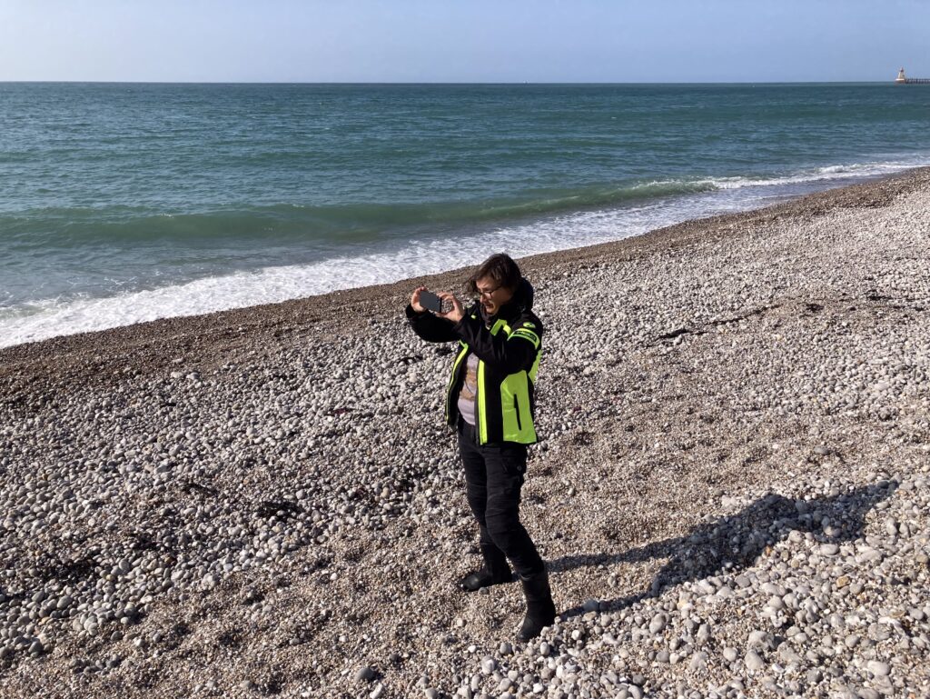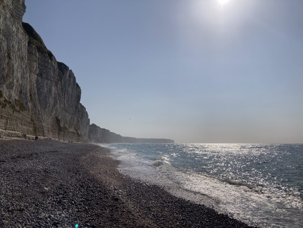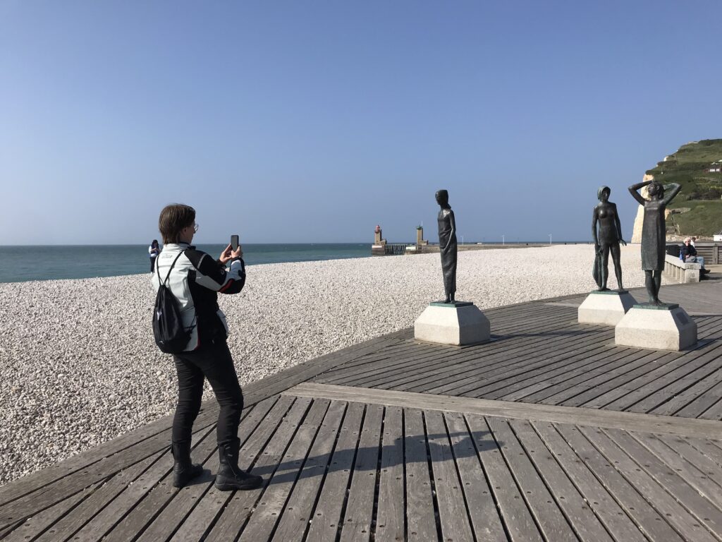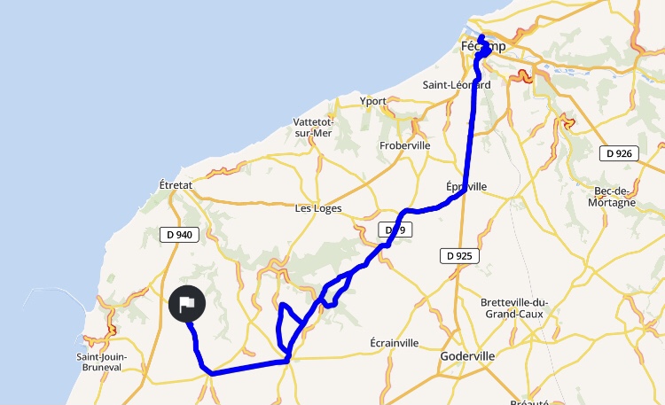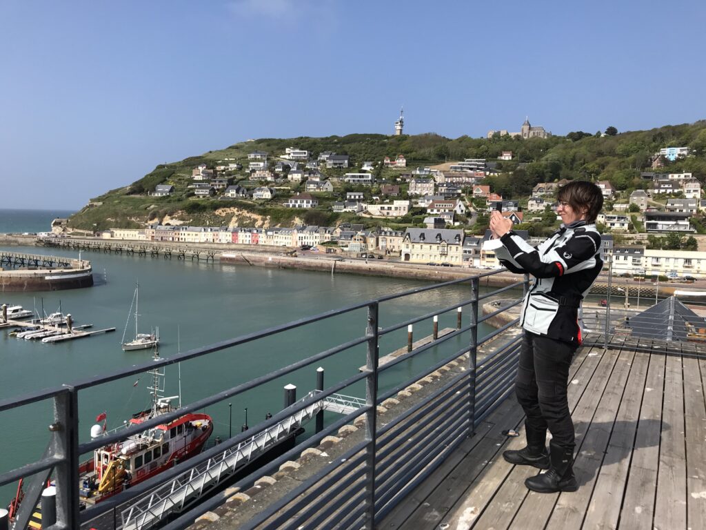 Mit leichtem Gepäck (sprich ohne Gepäck) fahren wir ca. 20km nach Fécamp. Wir haben das Navi wiedermal auf “kurvenreich“ eingestellt und schlagen uns auf geteerten Feldwegen durch die Landschaft. Bis zu einer T-Kreuzung, wo wir falsch abbiegen und dann laut palavern, wo es denn nun langgeht. Bei der folgenden Wende-Aktion (Gedächtnisnotiz: Motorradstiefel haben keinerlei Grip auf Sand und Kies), rammt sich SB das sowieso schon blaue Schienbein mit voller Wucht an eine Fußraste. Kurz gejault, Mopped gewendet und langsam geht es weiter. Dann ist auch der Grund für ein einsam parkendes Auto ersichtlich: ein Liebespaar in einem Feld. Durch unser lautes Palaver wurden bereits sämtliche Aktivitäten eingestellt und wir schauen zu, dass wir zügig weiterfahren… durch Felder und Wälder bis zu unserem Tagesziel: Fécamp.