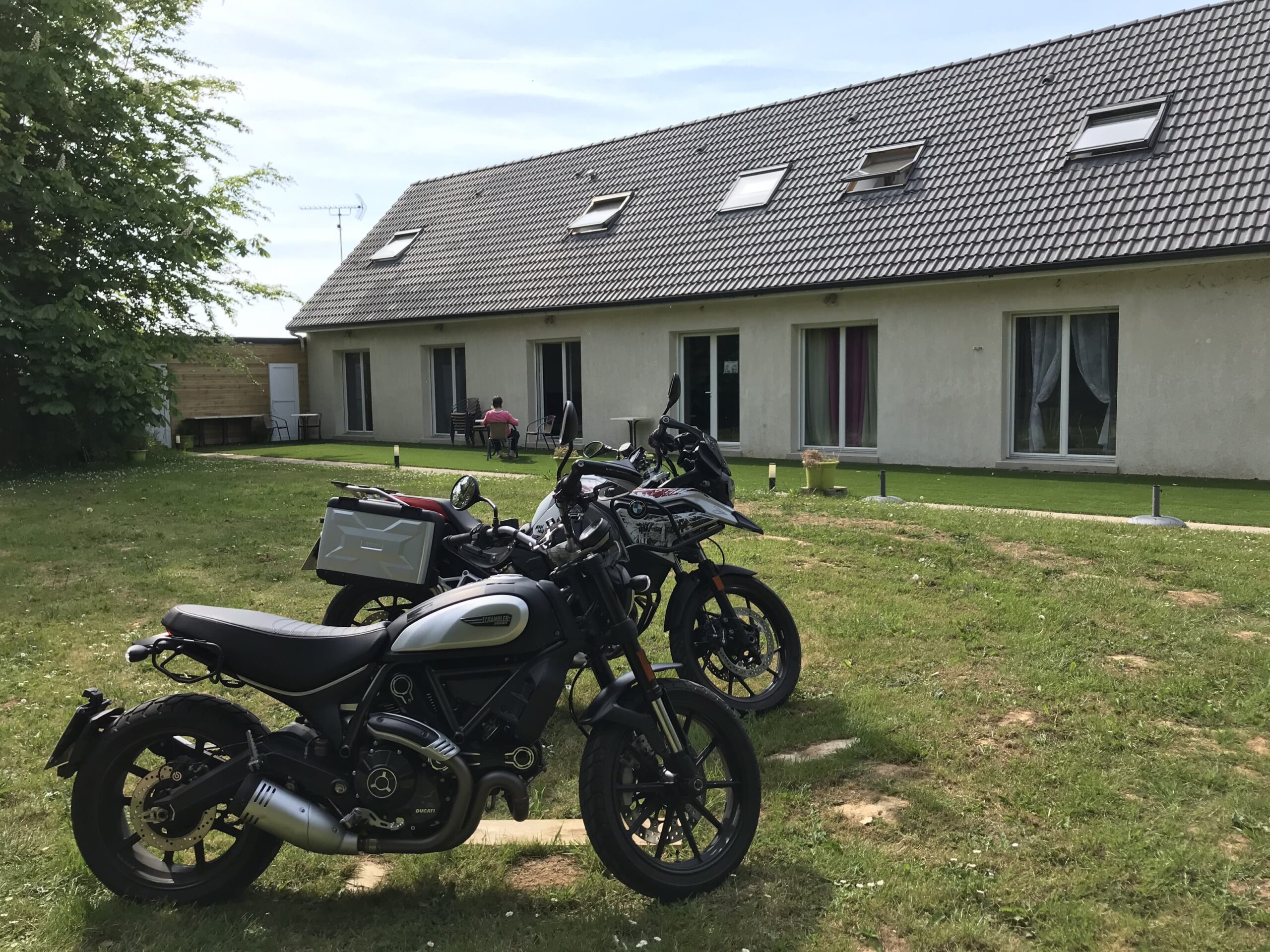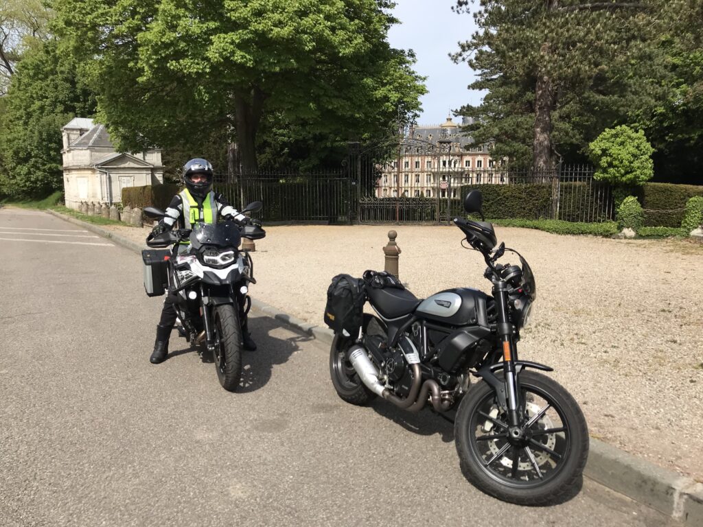 Entspannt fahren wir nach amüsanten Gesprächen mit François und gutem Frühstück die 5km nach Étretat. Da wir auf den entsprechenden Wanderwegen die Klippen entlang laufen wollen, kommen auch unsere Sneakers mit – aber dann wohin mit den ganzen Motorradklamotten? SL hat vorab ein Stahlgepäcknetz besorgt (hauptsächlich für die Fixierung von Trekkingrucksäcken gedacht), was wir unter viel Gefummel und Gefluche über den Krempel “werfen“. Für Profis, ambitionierte Amateuere oder auch Kinder ist das Entfernen des Netzes kein Problem, fürchten wir. Beim nächsten Mal wissen wir aber, wie es geht. Wer jetzt denkt aber wieso der Aufwand? Da sind doch riiiesige Koffer an der BMW? Da können wir mittlerweile nur noch milde lächeln, denn diese Koffer haben anscheinend weniger Volumen, als die Softbags von Black Pearl. White Rabbit ist ein Handtaschencarrier (die Koffer könnte man je Seite noch 12cm verbreitern, aber dann ist die Kiste einfach zu dick), das muss SB leider zugeben, nachdem SL nicht nur ihre Klamotten, sondern auch sämtlichen Proviant auf der kleinen Ducati verstauen kann.