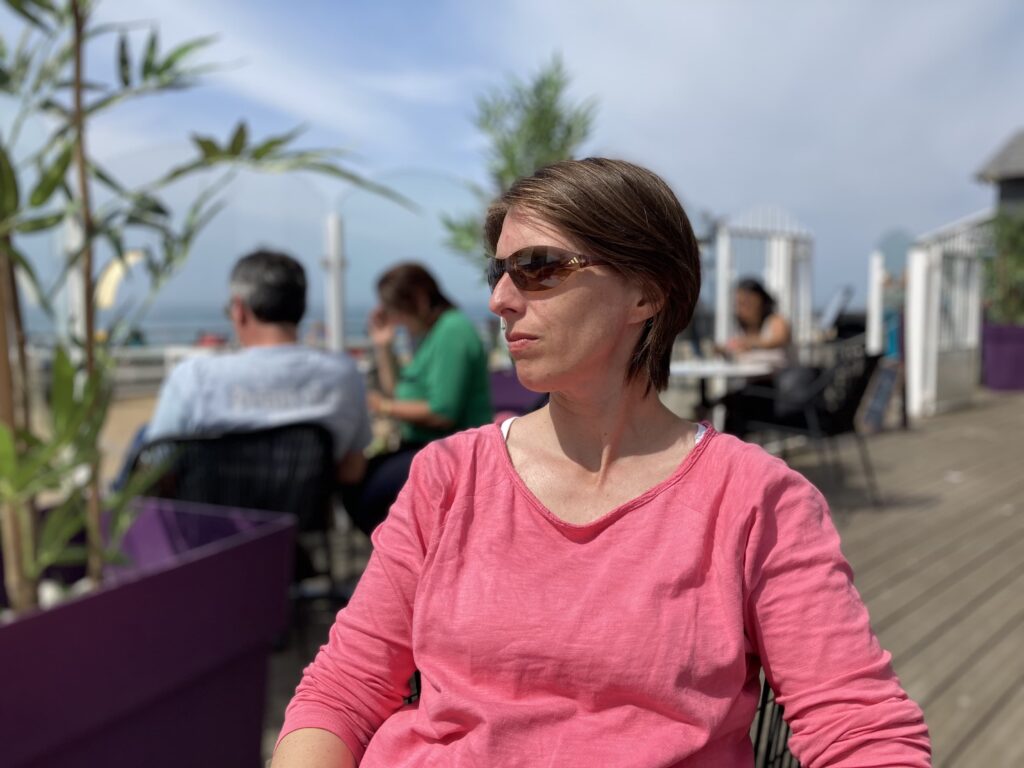 Zurück im Ort und auf der Promenade wollen wir eine Kleinigkeit essen. An jedem Restaurant stoppen wir, studieren die Speisekarte und bemühen dann Google für die Bewertungen. Nach 45 Minuten haben wir den Ort durchstreift, immer noch Hunger, aber alles ist sehr meeresfrüchte- und fleischlastig. So landen wir in einem nicht so gut bewerteten Ausflugslokal direkt am östlichen Ende der Promenade. Der Kaffee ist ok, gegessen wird lediglich eine Tarte Tatin (damit kann man ja nichts falsch machen), aber dafür haben wir eine klasse Aussicht.