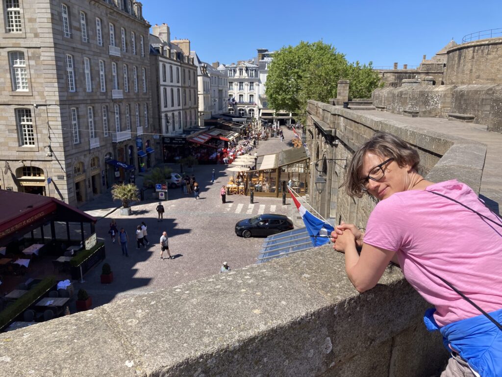 Der Tag beginnt herrlich sonnig und wir starten gemütlich und spät nach dem Frühstück zu Fuß in die Altstadt von Saint-Malo, genannt “Intra Muros“, da sie vollständig von einer Stadtmauer umgeben ist. Es sind etwa 20 Minuten durch ein Hafen-Gewerbegebiet bis sich vor uns die Stadtmauer zeigt. SL hat sich auch bis dahin wieder beruhigt, nachdem es ein Missverständnis gab, ob dies nun schon die Altstadt wäre (nein, noch nicht, dann doch …) – und dadurch ein perfekter Foto-Stopp verpasst wurde.