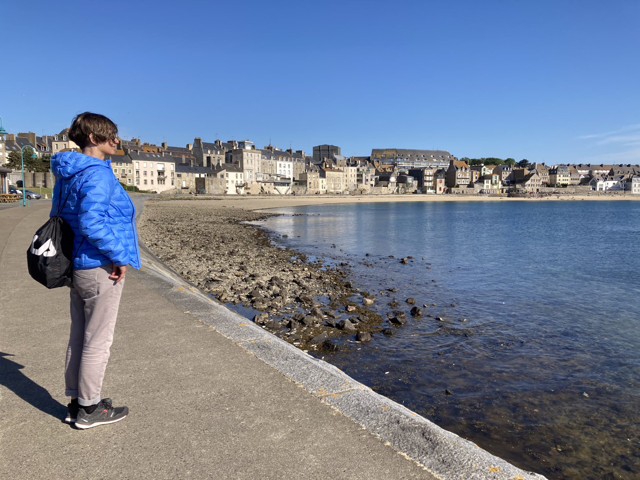 Der Tag beginnt herrlich sonnig und wir starten gemütlich und spät nach dem Frühstück zu Fuß in die Altstadt von Saint-Malo, genannt “Intra Muros“, da sie vollständig von einer Stadtmauer umgeben ist. Es sind etwa 20 Minuten durch ein Hafen-Gewerbegebiet bis sich vor uns die Stadtmauer zeigt. SL hat sich auch bis dahin wieder beruhigt, nachdem es ein Missverständnis gab, ob dies nun schon die Altstadt wäre (nein, noch nicht, dann doch …) – und dadurch ein perfekter Foto-Stopp verpasst wurde.