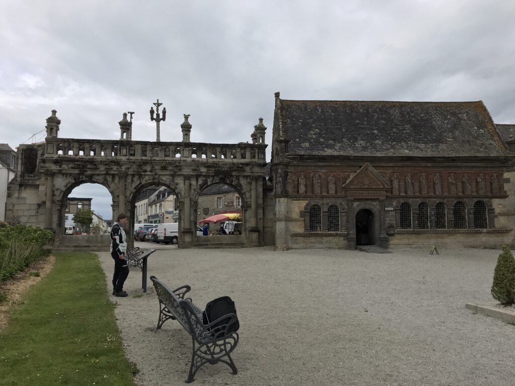 Wir starten heute ausnahmsweise mit der Route Nationale (Schnellstraße bis max. 110km/h und null Eindrücken der Umgebung) raus aus Morlaix, um schnell “Strecke zu machen“. Von dieser Trasse biegen wir nach 20km wieder auf Landstraßen ab und lassen uns durch Wälder, Wiesen und Ortschaften treiben. So kommen wir auch durch Sizun. Das Beinhaus und der Triumphbogen wecken beim Durchfahren unser Interesse und wir stoppen spontan. Wird sowieso Zeit für eine Pause. Auf dem kleinen pragmatischen Markt essen wir noch ein Galette. Gott sei Dank, denn dann hat erstmal wieder alles zu – und wir sind auch zu spät für den Supermarkt, um Wasser zu kaufen. Wir haben uns immer noch nicht an die großzügigen Schließzeiten der Geschäfte gewöhnt.