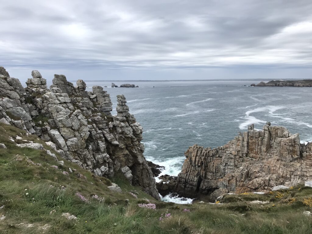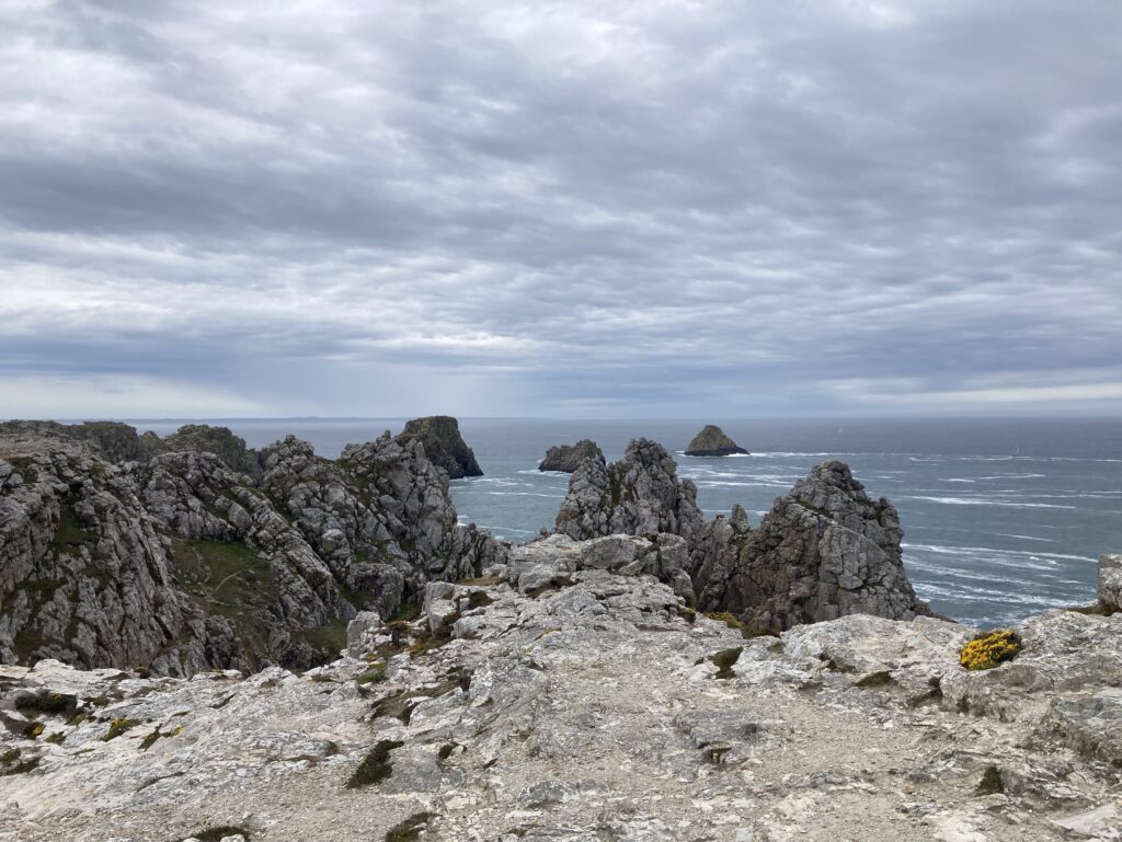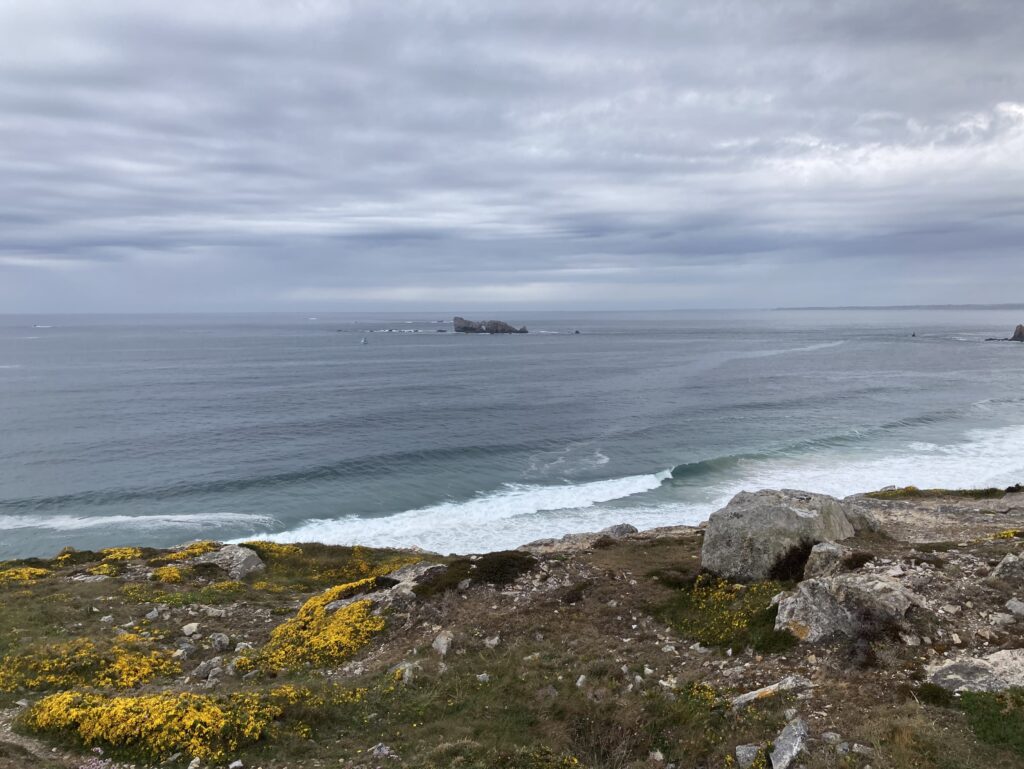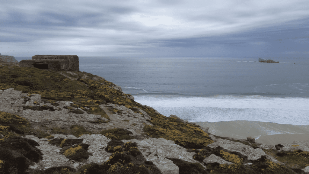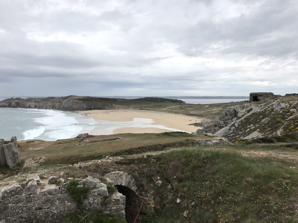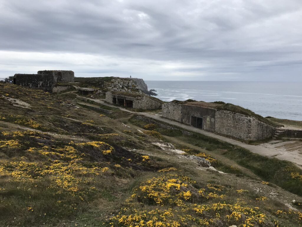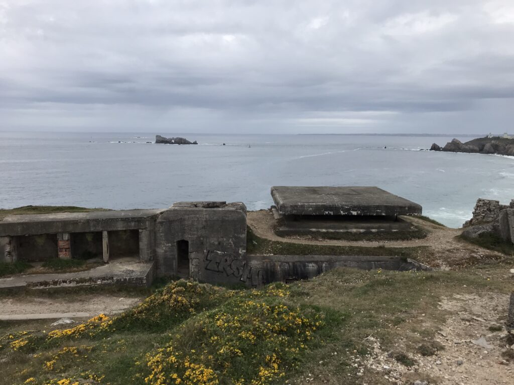 Bei wechselhaften, aber trockenem Wetter erreichen wir unser Tagesziel, das Kap Pen-Hir auf der Halbinsel Crozon. Auch hier deprimieren uns wieder die Erinnerungsstätten aus dem 2. Weltkrieg. Das Kap ist überzogen mit Bunkern und Abwehrstellungen, die zum Teil noch gut erhalten sind. Je nach Wetterlage kann diese Umgebung sehr beklemmend wirken… und wir haben so ein Wetter mit bedrohlichen Wolken.