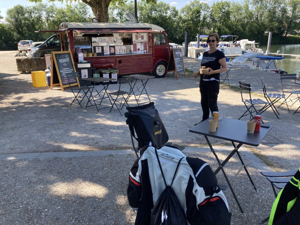 Zurück am Fluß Charente die Rettung, bevor die Laune sinkt: ein Foodtruck mit schattigem Plätzchen am Fluß.