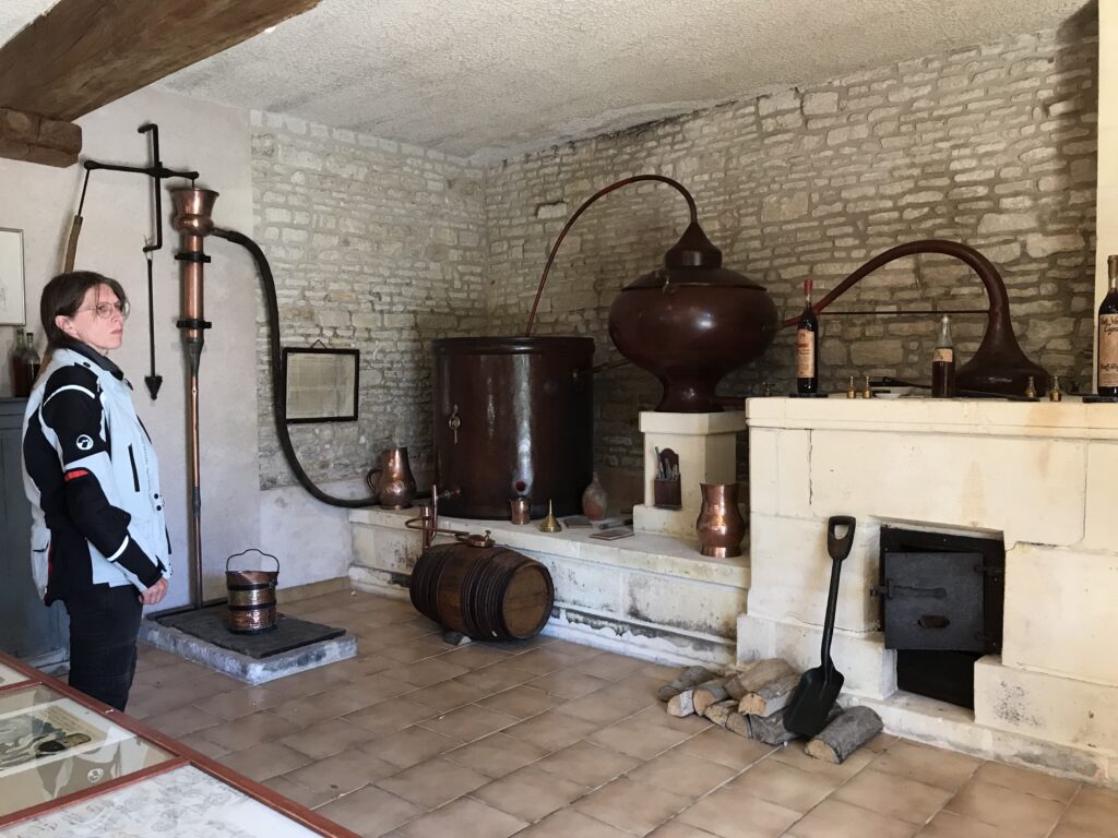 Auf dem Rückweg über Sigogne und wenige Kilometer entfernt von unserer Unterkunft hat das „Écomusée du Cognac“ in Migron auf. Es wird privat vom Cognac-Hersteller Tesseron (seit fünf Generationen in Familienbesitz) geführt und zeigt u.a. originale Werkzeuge und Alltagsgegenstände aus vergangenen Zeiten. Die Ausstellung und die persönlichen Infos gefallen uns sehr gut – besonders die anschließende kleine Verköstigung mit Cognac X.O. aus verschiedenen Lagen (25 Jahre Grande Champagne und 35 Jahre Fins Bois) für SB und drei Sorten Pineau für SL. Wiedermal zu wenig Platz im Gepäck – also wird nur ein Miniaturfläschchen X.O. Fins Bois geshoppt.
