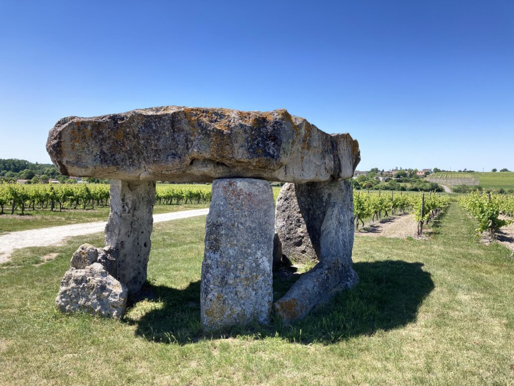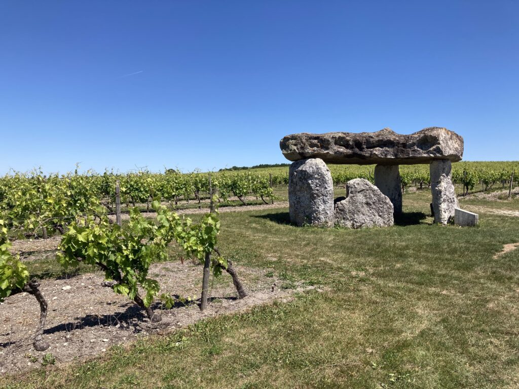 Der „Dolmen de la Pierre Levée (Saint-Fort-sur-le-Né)“ liegt wunderschön in den Weinfeldern auf einem kleinen Hügel. Er war lange versteckt unter einem Erdhügel, wurde wahrscheinlich im 19. Jahrhundert geplündert und ein Teil der Tragsteine abgeschlagen. Der Ort lädt zu einem Mini-Picknick ein – Brot, Käse und Erdbeeren.