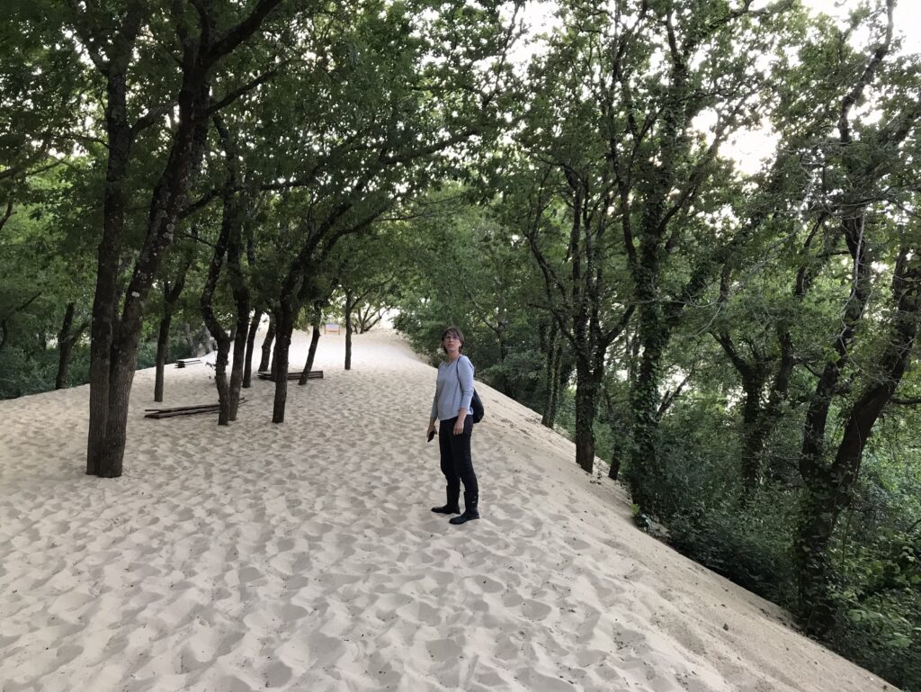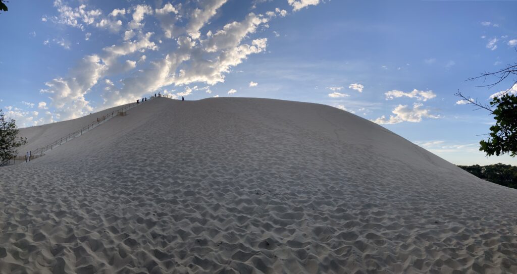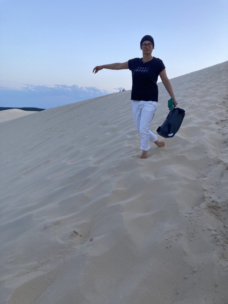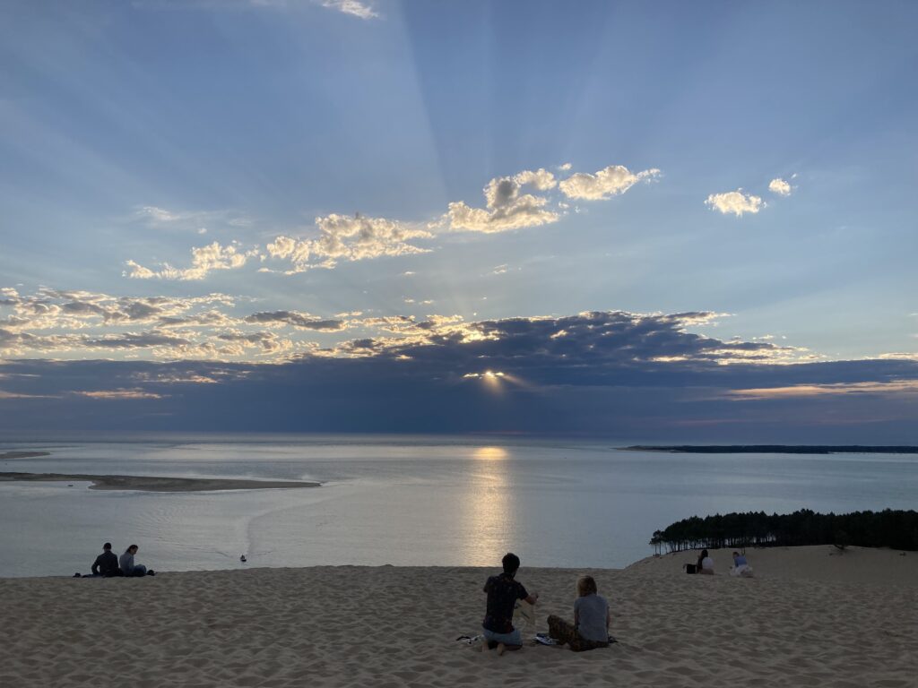 Dann schwingen wir uns nochmal auf die Moppeds und fahren zur Düne von Pilat, der höchsten Wanderdüne Europas. Bis zu 110m hoch, 500m breit und mehr als 2,5 km lang ist dieser Traum aus Sand. Wir stapfen auf der zum Glück vorhandenen Treppe hinauf und haben zwar aufgrund leichter Bewölkung keinen perfekten Sonnenuntergang, aber eine schöne Abendstimmung… und Cidre und Schaumbananen zum Abrunden. Das ist der perfekte Ausklang heute.