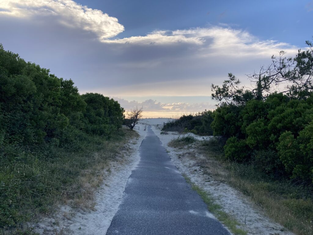 Im Vergleich zu den gewachsenen alten Dörfern mit Natursteinhäusern der vorherigen Routen sind hier in Strandnähe hauptsächlich reine Ferienorte zu finden. Die Häuser in “moderner“ Bauweise haben viel Platz und stehen oft schattig unter oder neben hohen Nadelgewächsen. Einer dieser Orte ist unser Tagesziel, wo wir in einer Ferienwohnung direkt am Golfplatz für drei Nächte bleiben: Moliets-et-Maâ.