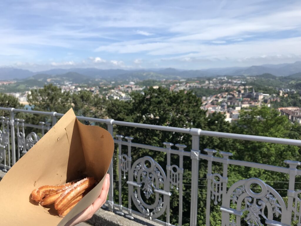 Besser schaut man auch in die Ferne, denn der Ausblickshügel ist auch ein kleiner historischer Freizeitpark mit Spaßangeboten vergangener Zeiten (man steht zwischen Kinderfahrgeschäften und einer morbiden Miniachterbahn – heute alles geschlossen, wir beschweren uns nicht 😉). Wir nutzen die Infrastruktur aber für überraschend gute, frisch gemixte Sangrias und frisch gebrutzelte Churros aus zwei Verkaufsständen. Mit Blick auf die Stadt und bei Kaiserwetter knuspern wir die süßen und noch heißen Stimmungsaufheller aus einer Papiertüte.