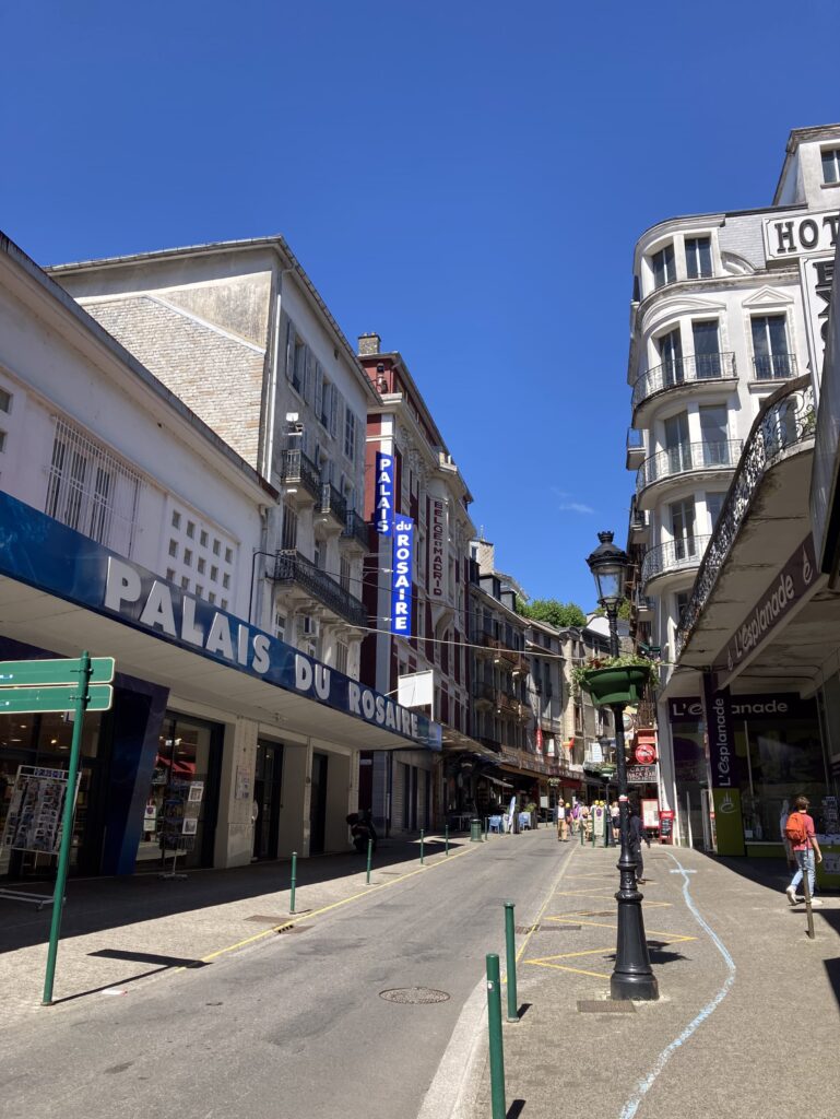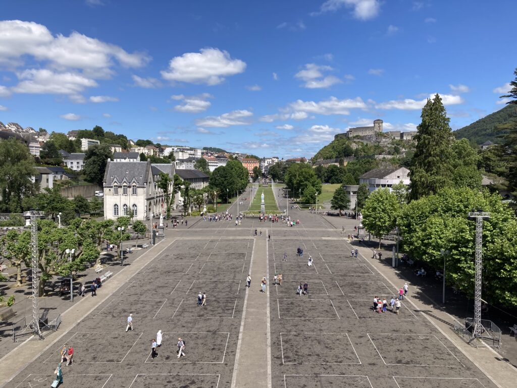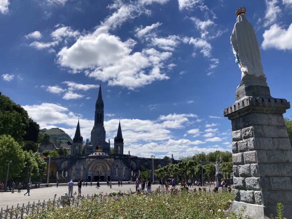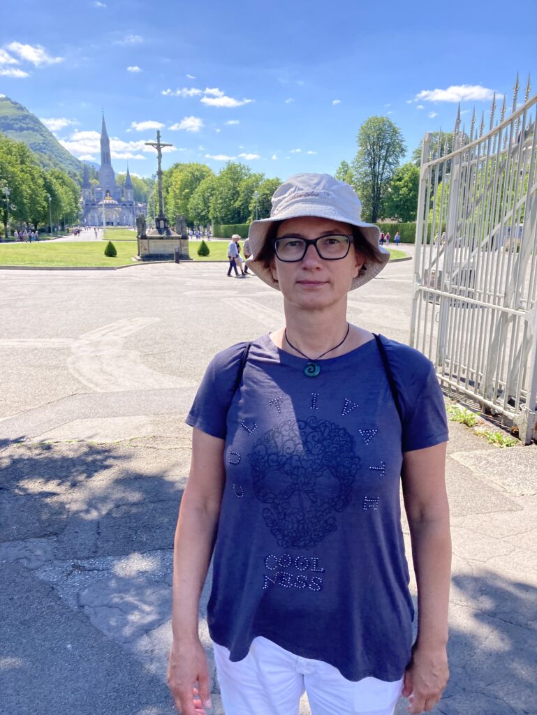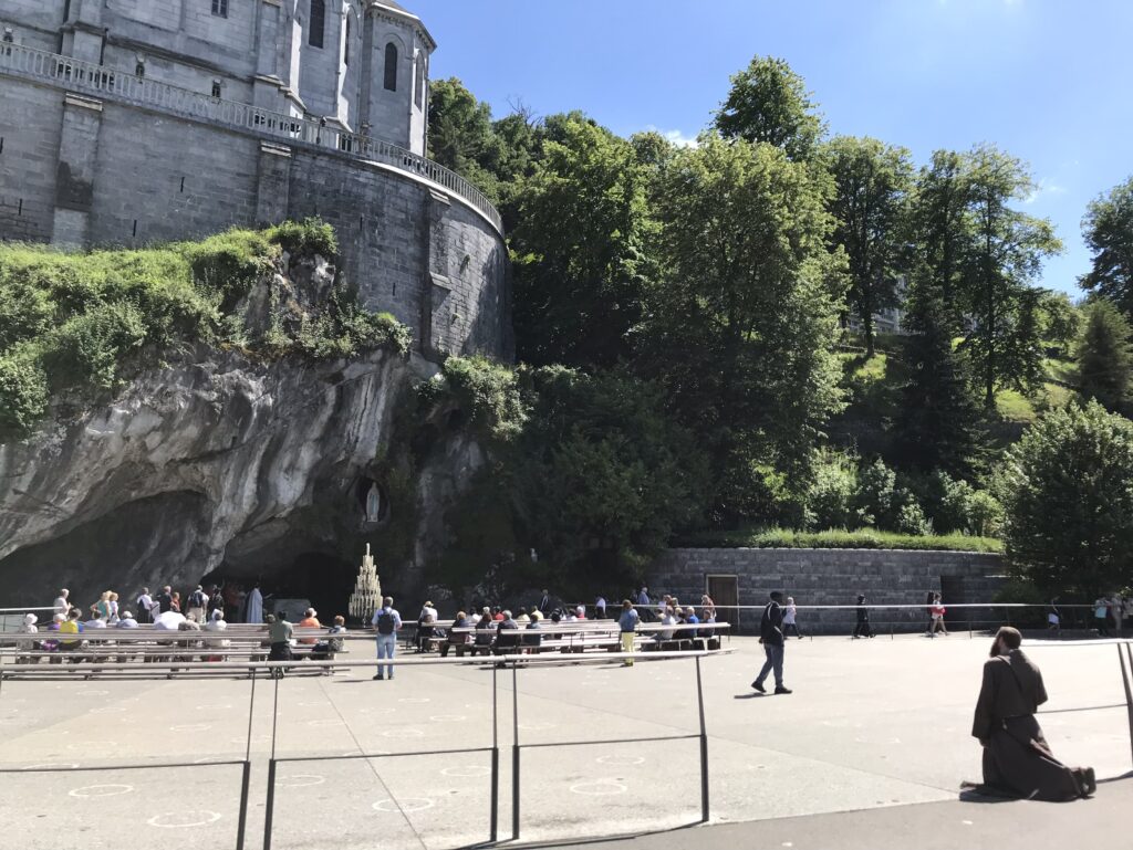 Nach einer kurzen Pause wollen wir zum Wallfahrtsort und sind bei dem Gang durch den Ort überrascht, dass viele Gebäude leer stehen und verfallen sind. Der morbide Eindruck wird durch den lebhafteren Teil der Straße zum Wallfahrtsort mit den furchtbaren „billigen“ Souvenirs ergänzt. Neben Kanistern und Flaschen in allen Größen für das angeblich heilende Wasser bekommt man alles was das Pilgerherz anscheinend begehrt. Die Souvenirläden tragen Namen wie „Palais du Rosaire“ – wir haben keine weiteren Fragen. Vollends überrascht sind wir vom Platz vor und am Wallfahrtsort: auf uns wirkt alles wie ein religiöser Freizeitpark ohne Flair und Ambiente. Die Grotte selber befindet sich mit der Quelle außen, unterhalb der Kirche.
