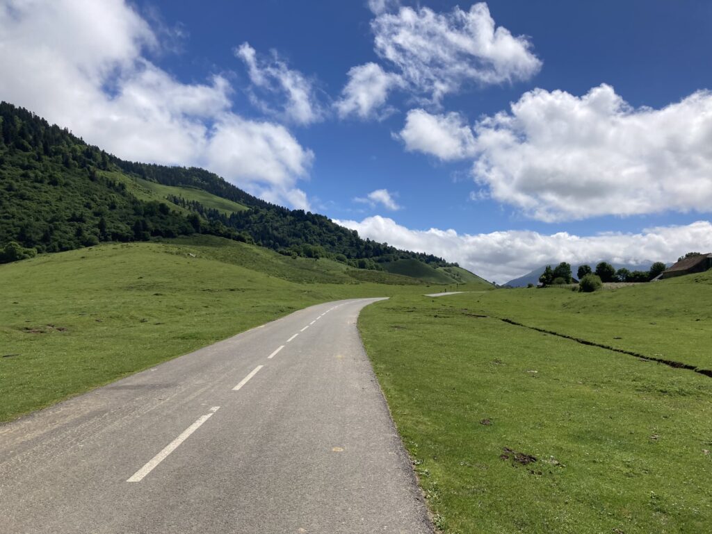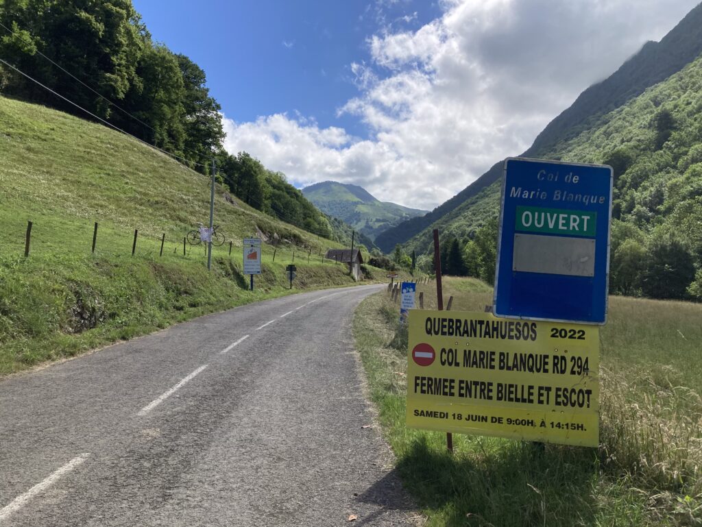 Wir müssen noch die gestrigen Kurven und Eindrücke verarbeiten und wollen es heute etwas geradliniger angehen. Lourdes liegt in Okzitanien in den Ausläufern der Pyrenäen und so werden die Kurven wieder weiter und flacher. Die landwirtschaftlichen Nutzungsflächen mit viel Getreideflächen und Weinfeldern werden entlang der Strecke wieder mehr. Montory, Arette, Issor durchfahren wir auf der D918. Dann geht es ein Stück auf der Route National bis Escot und von dort auf der D924 zum Col de Marie Blanque, der schon einige Male Teil der Pyrenäenetappen der Tour de France war. Den Col du Porteigt, eine schöne Hochebene mit Pferden, nehmen wir einfach so mit… liegt auf der Stecke.