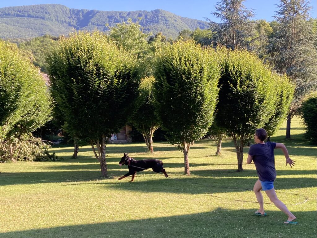 Am frühen Abend treffen wir in einem tollen Bed & Breakfast ein. Dort verpulvert SL ihre restliche Energie beim Herumtollen mit Rocky, dem 17 Monate alten Hofhund. Wir hatten nur für eine Nacht gebucht, aber es gefällt uns dort so gut, dass wir spontan noch eine Nacht dranhängen. Mit einem lauen Sommerabend und den restlichen Crêpes lassen wir den Tag auf der eigenen Terrasse ausklingen.