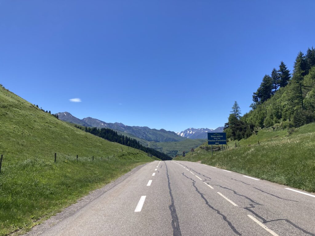 Bis Montgaillard geht es auf der D937 dahin. Dann auf der D935 über Trébons, Pouzac, Bagnères-de-Bigorre. Vor Pyrehitte biegen wir auf die erste Passtraße D918 zum Col d‘Aspin ab. Hinter Campan beginnt der Aufstieg. Was uns kalt erwischt: der komplette Anstieg ist mit Rollsplit bedeckt, denn hier wurde gerade die Straße ausgebessert. Positiv denken und hoffen, dass es auf der schwierigeren Abfahrt im Osten besser wird!
