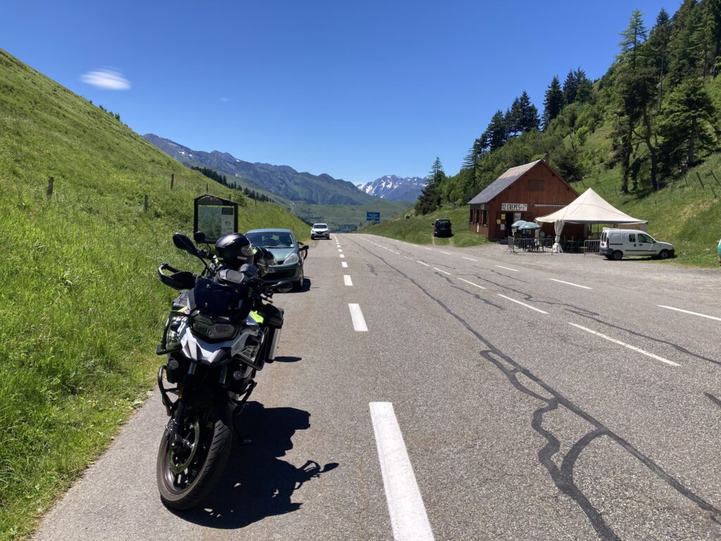 Weiter geht es durch die tolle Landschaft auf der D618 zum nächsten Pass, dem Col de Peyresourde. Die Strecke wird wieder mit Rennfahrern geteilt, ansonsten sind wir fast die einzigen motorisierten Verkehrsteilnehmer. Auf dem Col de Peyresourde, der an ein großes Skigebiet mit Flughafen angrenzt, steht eine Hütte, die auf einem großen Schild 12 Crêpes für 7 Euro anbietet. Auf Empfehlung der deutschsprechenden Bedienung bestellen wir die Süßigkeit nebst Kaffee. Es ist nicht ganz klar wieso es ausgerechnet 12 Crêpes sind, wir schaffen auch nicht alle, aber der Rest kommt inzwischen hemmungslos in unsere Tupperdose.