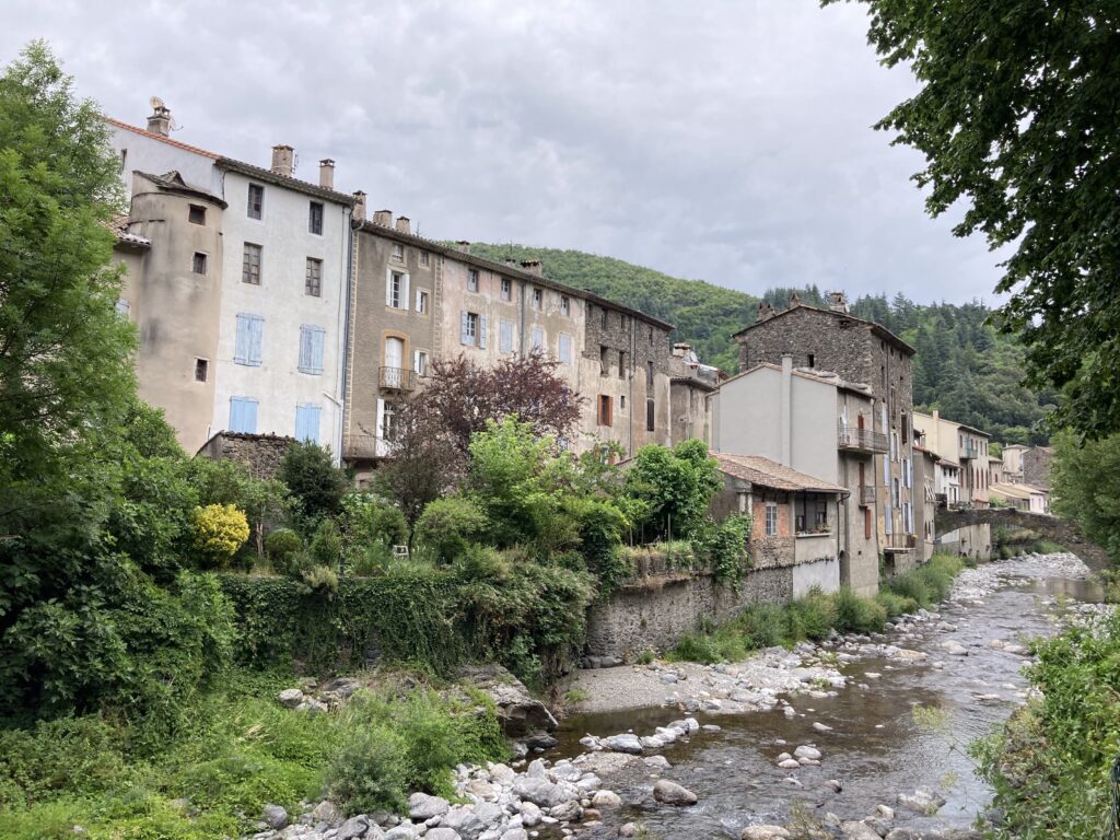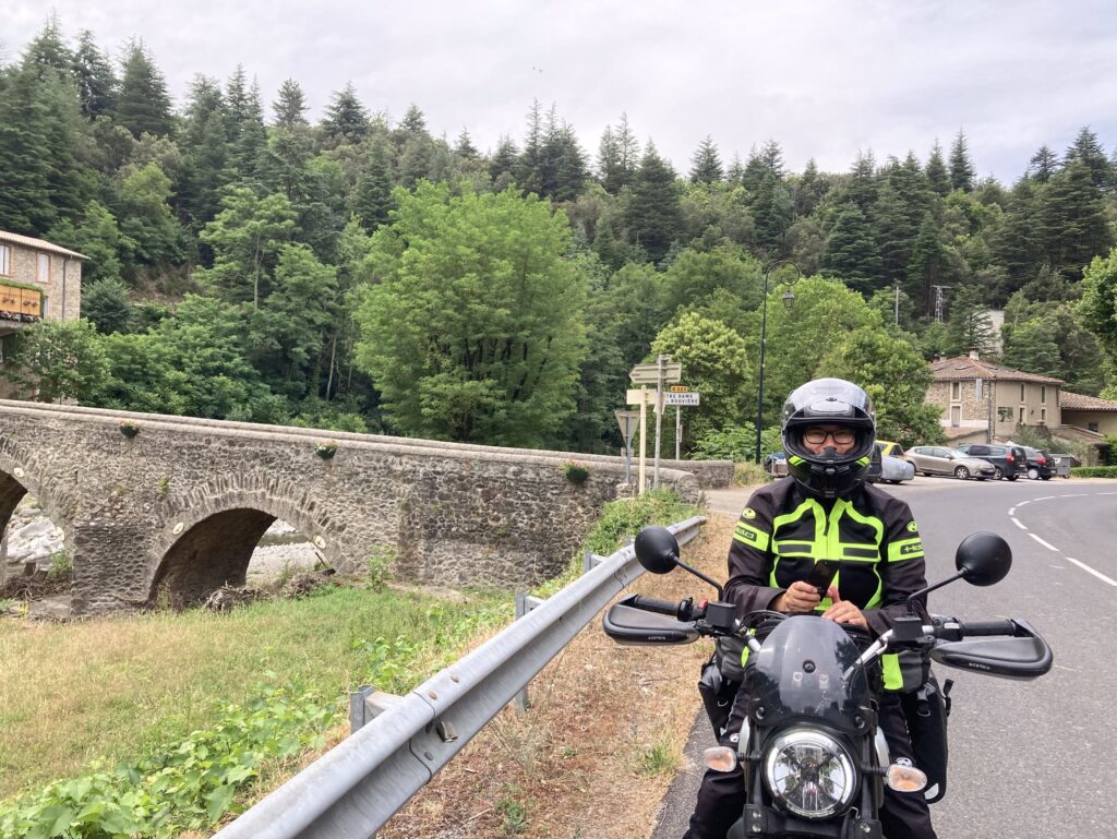 Kaum gestartet, dampft es schon in den Klamotten – das Thermometer zeigt immerhin schon ca. 30 Grad. Der warme Fahrtwind ist da fast angenehm. Mit wenig Verkehr führt uns die D999 am Hérault entlang und schon durch den Anfang des Nationalparks der Cevennen. Bei Pont d’Hérault geht es auf die D986 – in einer sanften Schlucht durch malerische Mini-Dörfer, vorbei an alten Brücken, Seidenspinnereien und Mühlen. Motorradtaugliche Haltemöglichkeiten gibt es wenige (wir wollen keine Fahrbahnbankettabsätze von 15-20 cm in losem Kies überwinden). Die alte Brücke und die ehemalige Seidenspinnerei von Mazel knippsen wir von der Straße aus.
