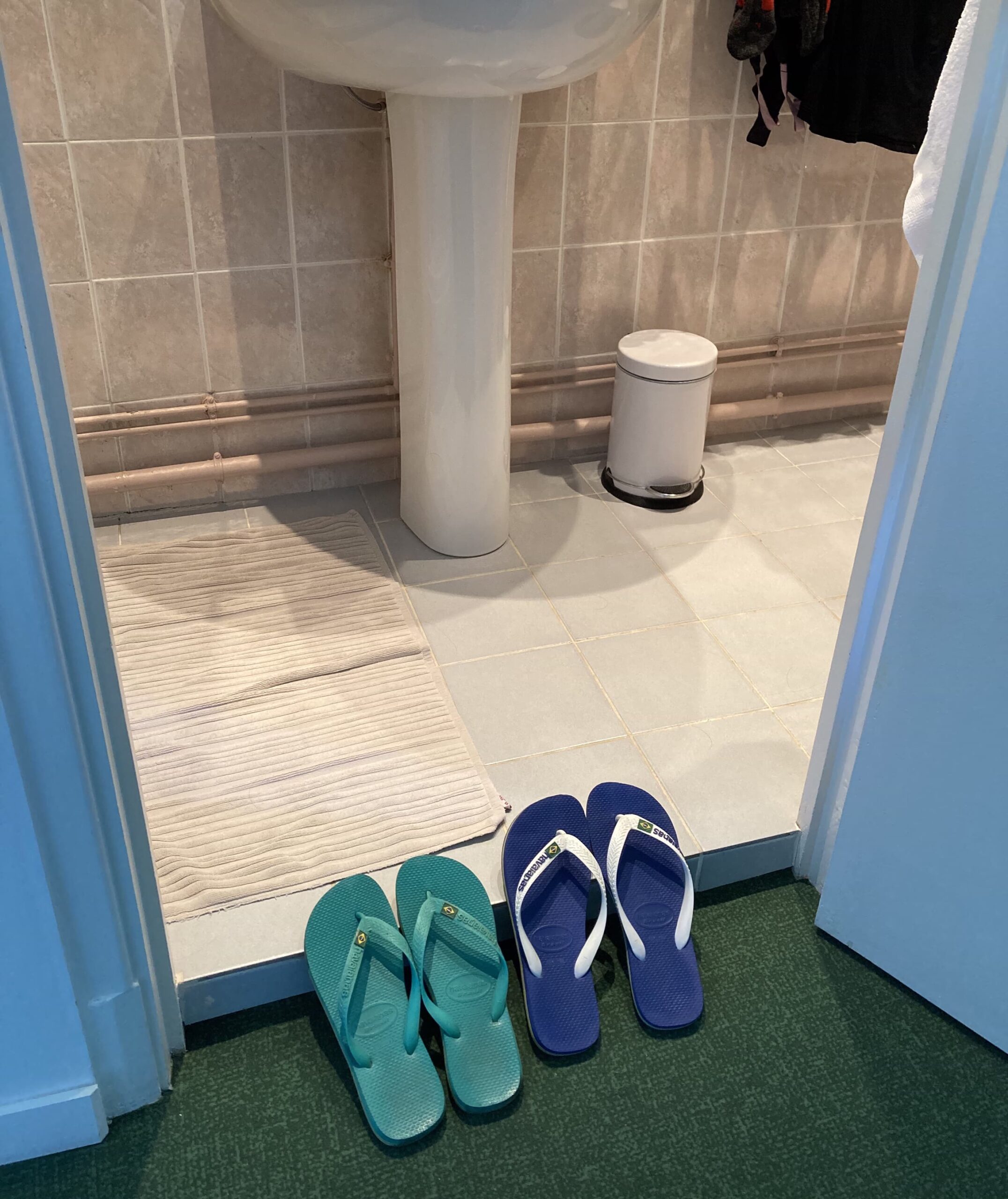 Da SB aufgrund der Hitze nicht mehr in der Lage ist, die 5 cm Stufe zum Badezimmer unfallfrei zu überwinden und bereits links und rechts der jeweils große Zeh blau ist, entschärft SL pragmatisch die Stolperfalle.