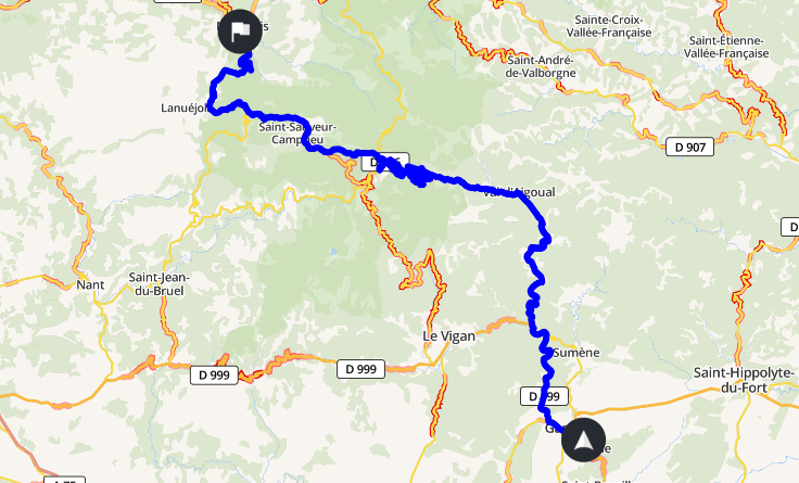 Heute geht es von Laroque nach Meyrueis. Aisha versorgt uns in ihrer Küche mit Frühstück und verabschiedet uns mehr als ein Mal herzlich, weil ihr immer wieder etwas einfällt, was sie uns noch sagen oder mitgeben möchte. Der finale Abschied findet dann bei den Motorrädern auf der Straße statt. Dort dreht unsere quirlige Gastgeberin ihre Guten-Morgen-Runde bei den Nachbarn, während wir mit unserem Gepäck hantieren. Jetzt aber: Merci beaucoup et au revoir!