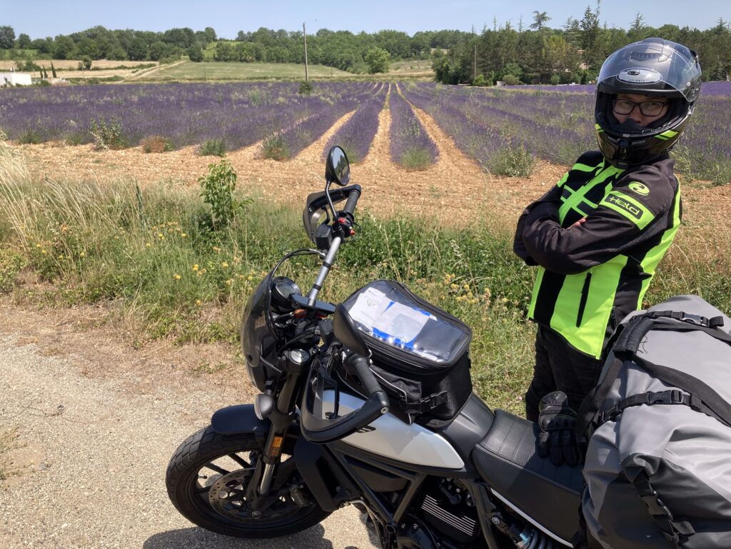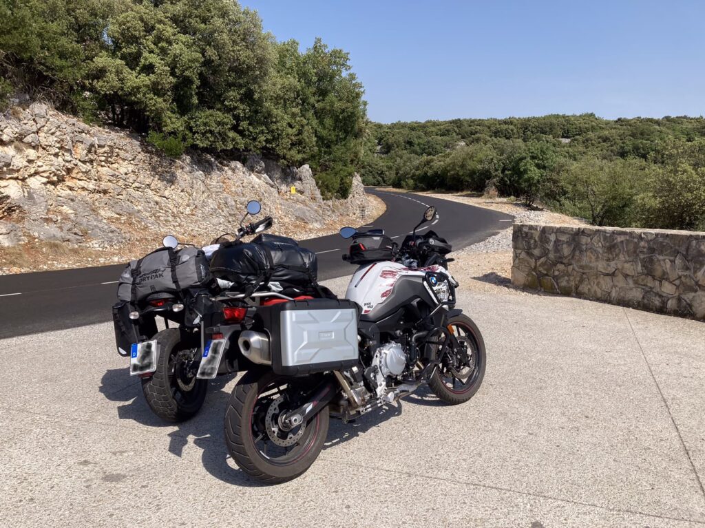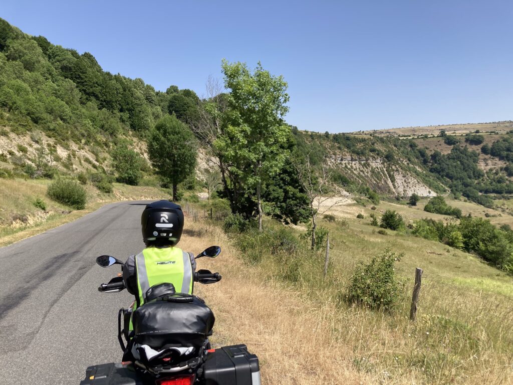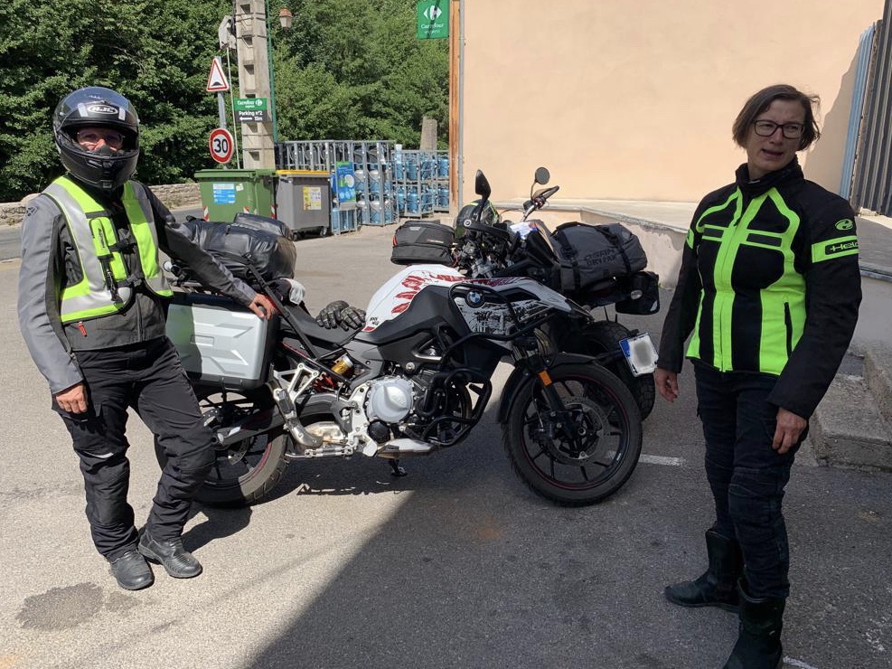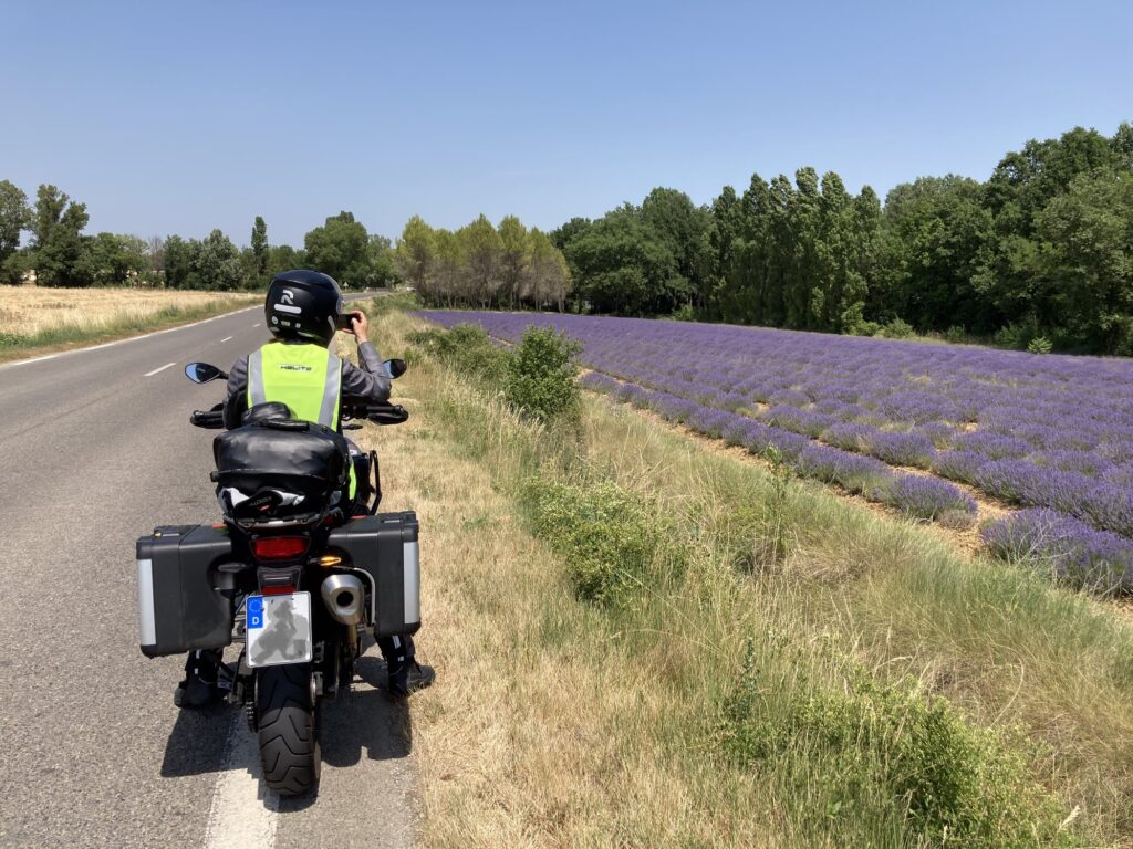 So schön die Aussicht, so übel der Straßenbelagszustand: Rollsplitt, Flickenteppich, Bitumenbänder, fehlende Leitplanken. Das geht in dieser Qualitätsstufe so bis Florac und erzwingt vollste Aufmerksamkeit. Ab Florac rutschen wir auf der N106 ein kurzes Stück gut ausgebaut bis kurz vor Alès an der Mimente entlang. Alès begrüßt die Reisenden mit einem stattlichen Industriegebiet. 37 Grad quälen uns mittlerweile… da reicht schon ein kurzes Hupen und Blinken von SL, um SB zu signalisieren “raus aus dem Kreisel und ab zum ‚Goldenen M’ für eine Abkühlung“! Mit kühlerem Kopf führt uns die D16 nun in eine ganz andere Landschaft. Toskana-Feeling mit Weinfeldern, Pappeln und Zypressen, gemischt und unterbrochen durch vereinzelte, bereits blühende Lavendelfelder. Das Violett dieser Blumen und der Duft beim Vorbeifahren entschädigt für die Hitze. Noch sind wir nicht in der Hochburg der Wohlgerüche in der Provence, aber es macht Lust auf mehr.