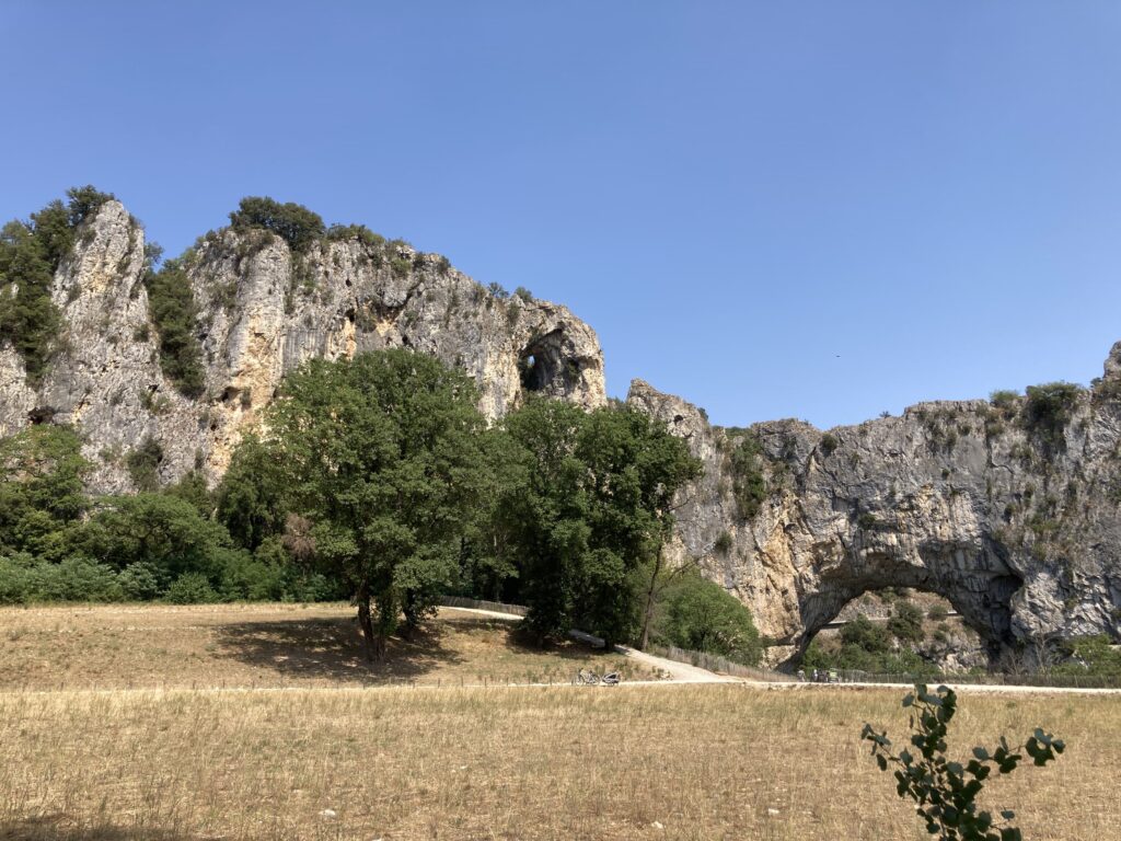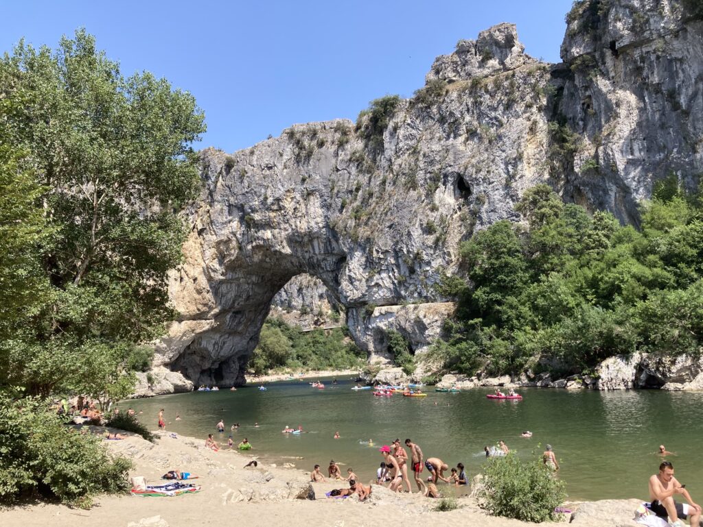 Die viel befahrene Straße ist durch den enormen Tourismus sehr gut ausgebaut und auch für Busse befahrbar. Kajak, Canyoning und Baden sind hier die Attraktionen. Nach wenigen Fahrminuten erreichen wir den Parkplatz für die Pont d‘Arc, den 60 m hohen Natursteinbogen über den Fluß Ardèche. Diese Felsenbrücke ist wesentlich größer als vorgestellt und dominiert die Ansicht. Zu ihren Füßen ist ein gut erreichbarer Badestrand, der bei 35 Grad sehr rege frequentiert ist.