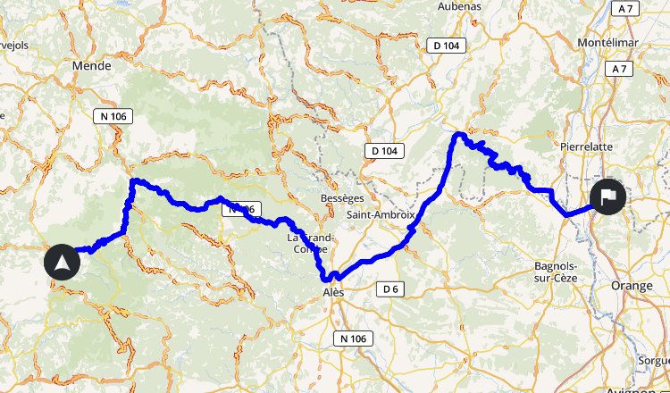Bei Saint-Just-d‘Ardèche ist die Schluchtentour zu Ende und wir nehmen die D86/D6086 bis Pont-Saint-Esprit. Dort queren wir den Fluß Rhône über eine sehenswerte Brücke (Haltepunkt verpasst für ein Foto) und rollen nun unspektakulär in der Region Provence-Alpes-Côte d‘Azur auf der D994 bis Bollène.