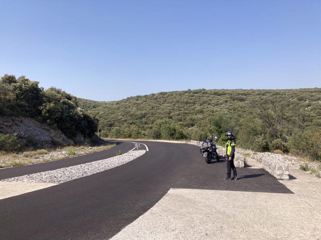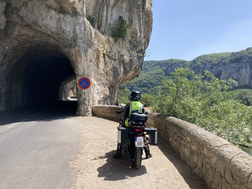 Wir baden nicht, sondern ziehen weiter Richtung Süden, immer der Schlucht folgend. Die dort verlaufende D290 bietet fantastische Aussichten, Felsen, Überhänge und Tunnel. Im Gegensatz zu Jonte und Tarn teilt man sich dieses Revier im nördlichen Teil der Schlucht allerdings mit Bussen, wild fahrenden Kajaktransportern und Motorradtrupps. Abgesehen davon eine schöne Tour! Der Straßenbelag im südlichen Teil ist neu und bietet im weiteren Verlauf tolle Aussichtspunkte mit Parkplätzen. Dort fahren wir auch relativ alleine.