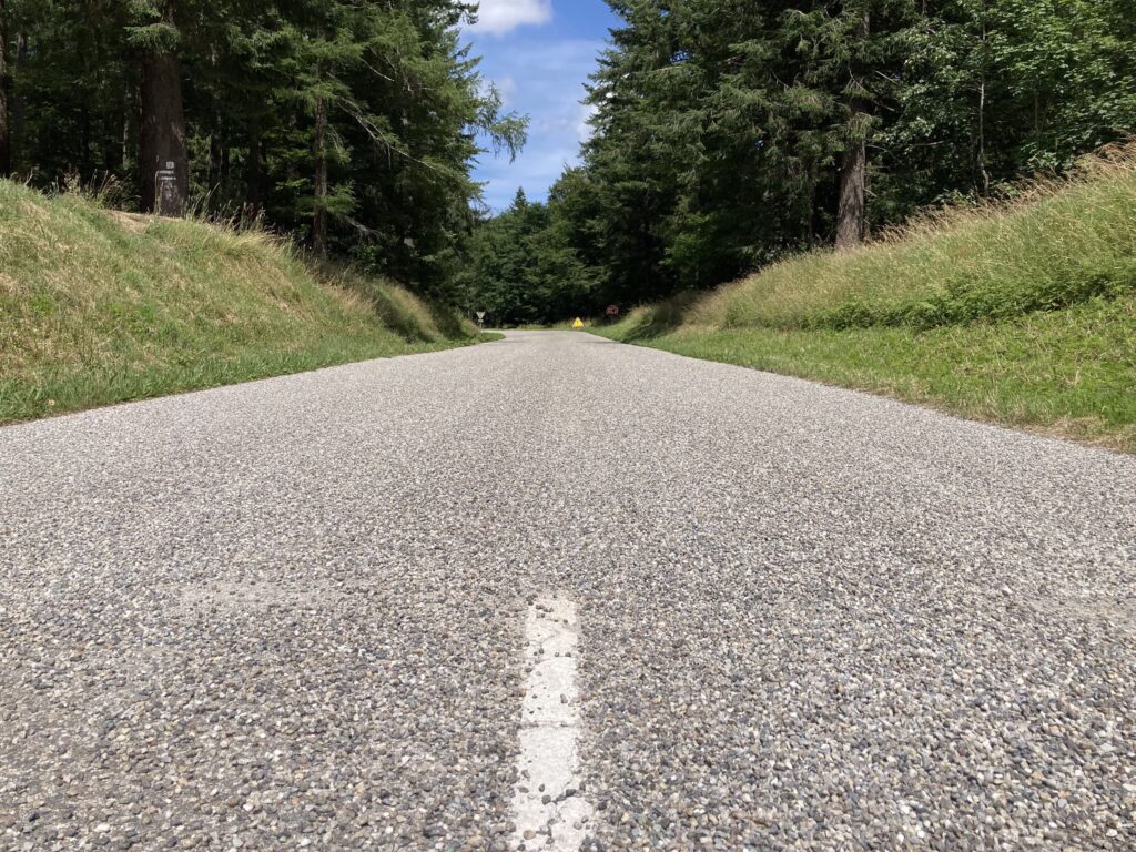 Dann haben wir am Ende der Strecke bei Le Bonhomme mal wieder ein Deviation-Schild: Straße komplett mit Schotter bedeckt, Motorradfahrer können aber fahren – auf Rollsplitt?!