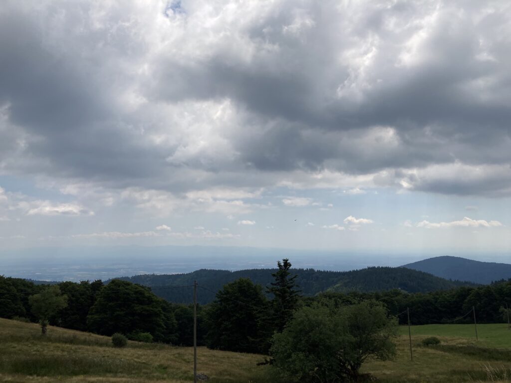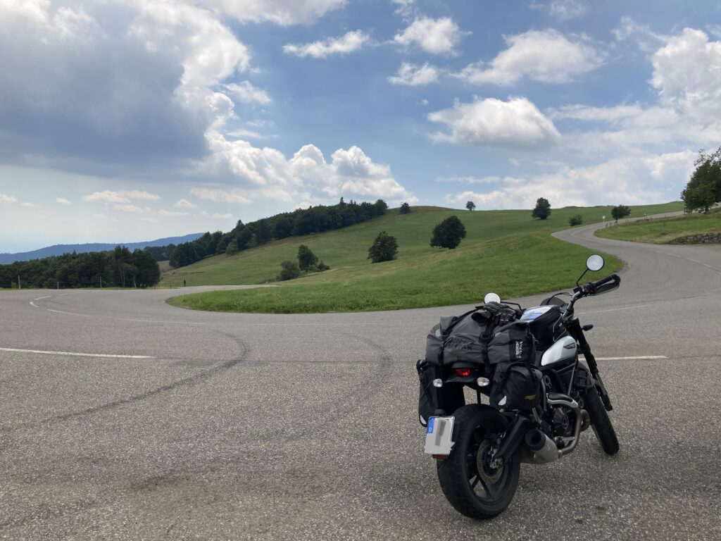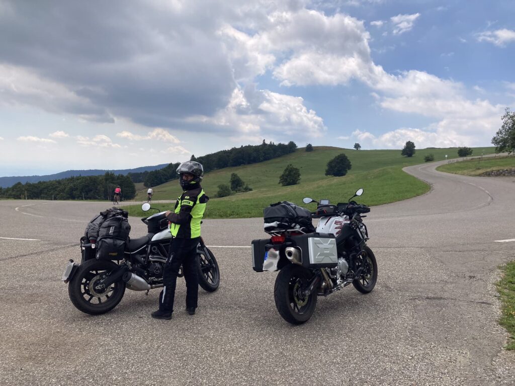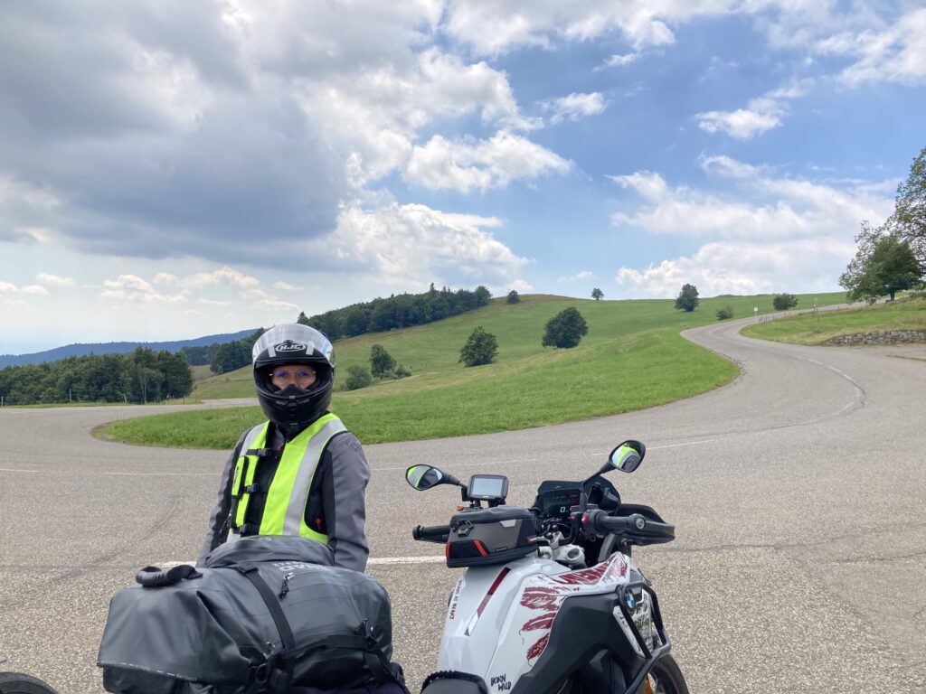 Irgendwann erreichen wir die Baumgrenze und mit dem Grand Ballon tauchen die ersten Skiorte auf. Landschaftlich finden wir es nicht ansprechend: es erscheint alles kahl und hügelig. Die traumhafte Aussicht in die Ferne bleibt uns aufgrund der Bewölkung leider verwehrt. Es ist recht frisch, um die 14-16 Grad. SB muss irgendwann auf eine dickere Jacke wechseln. Noch dazu ist es ihr nicht in den Sinn gekommen, rechtzeitig die Griffheizung an zu machen. Also müssen die steifgefrorenen Griffel unterwegs am Motorblock gewärmt werden.