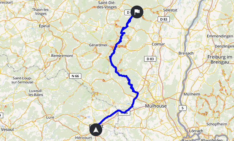 Wir umfahren auf der breiten D415 das Stückchen bis Le Bonhomme, kommen auf die D48 und passieren bei Tellure eine Silbermine, die man besichtigen könnte. Endlich sind wir in Sainte-Marie-aux-Mines. Von dort ist es nur noch ein kurzes Stück bis Thannenkirch, wo wir heute nächtigen. Leider gehen die letzten Kilometer auf einem losen Schotterbett nach oben. Unfassbare Zustände für Zweiräder… aber wir sind entspannt und fahren zwar langsam aber mittlerweile vollkommen unbeeindruckt weiter. Mehr Kilometer hätten es heute nicht sein dürfen. Das ist unsere letzte Übernachtung der ganzen Tour – und es fühlt sich komisch an.