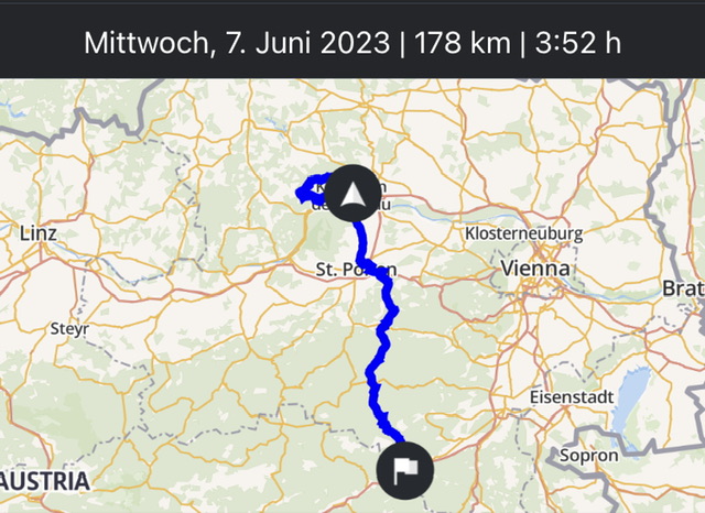 Unspektakulär geht es bis nach St. Pölten. Ab dort suchen wir uns Nebenstraße durch Wald und Wiesen über Siebenhirten, Gstetten und Michelbach am Markt. Wir bleiben auf der L 132 und fahren durch „Rohrbach an den Gölsen“ und dort auf die L 133. Nun wird es idyllisch. Die Strecke verläuft kurvenreich entlang des Halbbachs durch eine Klamm. Dahinter passieren wir Kleinzell, Hölle und „Kalte Kuchl“ (die Ortsnamen sind teilweise echt sensationell 😃).