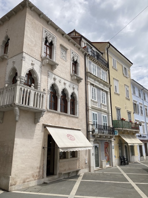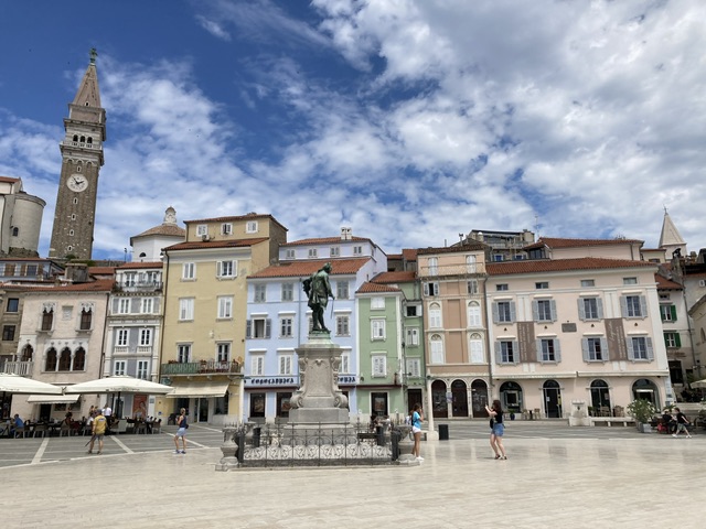 Schmale Gassen und eng aneinander gereihte alte Häuser – das Schlendern macht hier Spaß. Piran ist unglaublich fotogen und soll die schönste Küstenstadt Sloweniens sein. Das ist bei den sage und schreibe 46 Küstenkilometern Sloweniens nicht schwierig, aber Piran ist tatsächlich ein echter Hingucker. Schnell schießen wir auf dem Tartiniplatz noch ein paar Fotos der hübschen Häuser im venezianischen Architekturstil. Der Platz war ehemals das innere Hafenbecken, das am Ende des 19. Jahrundert zugeschüttet wurde. Die knapp 40 Jahre bestehende Straßenbahnlinie Pirano-Portorose (bis 1953) hatte dort ihre Wendeschleife. Die Ellipse aus hellem Marmor soll dies versinnbildlichen.
