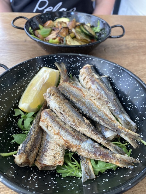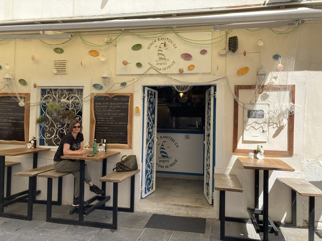 Wieder in der warmen Sonne meldet sich der Magen. Wir suchen uns in einer Gasse ein Streetfood Restaurant und essen vorzügliches frisch gegrilltes Gemüse und Sardinen (Anmerkung: wie auch in Frankreich ist auch in Tschechien und Slowenien vegetarisches oder gar veganes Essen die absolute Seltenheit auf den Speisekarten).