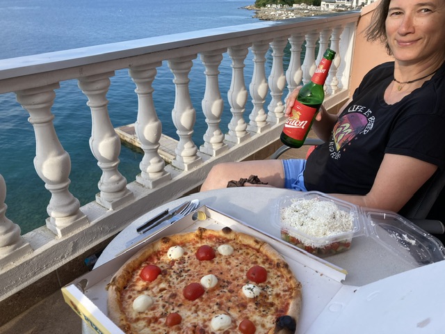 Abends gibt es Bier und Pizza auf dem herrlichen Balkon… einfach toll mit dieser Aussicht auf die Adria.