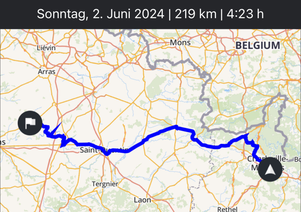 Auch das Frühstück ist im Ibis Hotel Charleville-Mézières unerwartet lecker mit backfrischen Madeleines und gutem Kaffee. So gestärkt geht es bei schlanken 12 Grad direkt auf den Asphalt. Unser heutiges Ziel ist Albert im Département Somme.