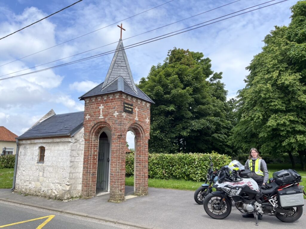 SB gelingt eine richtige Schräglage aus der Not heraus durch engeren Kurvenverlauf … (SL fährt dahinter und ist beeindruckt und besorgt zugleich) … und danach ist erstmal ein Päuschen angesagt – da stehen wir bei der Kapelle genau richtig 😉