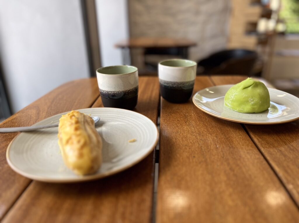 Dann spazieren wir durch die alten Gassen. Es ist ganz beschaulich und wenig los. Im Supermarkt hat SB schon ein knall grünes Dessert erspäht, dass es auch hier in einer Pâtisserie gibt. „Figue“ – eine „Feige“ aus Brandteig und Vanillecrème mit Marzipanhülle. Das, eine Passionsfrucht Éclair und zwei gute Kaffee heben unsere Stimmung!