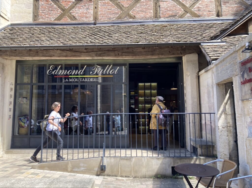 Zwischen den Sehenswürdigkeiten der Altstadt kehren wir auch immer wieder in eines der zahlreichen Souvenirgeschäfte ein. DAS Souvenir schlechthin aus Dijon ist natürlich Senf. Wobei „Dijon Senf“ keine Herkunftsbezeichnung, sondern eine Rezeptur ist. Dieser Senf wird aus braunen Senfkörnern hergestellt und mit Traubenmost statt Essig angesetzt. Eine auch in Deutschland bekannte Marke ist die Firma Maille. In der Fußgängerzone gibt es einen Maille Store mit besonderen Senfsorten. Seit 2009 wird jedoch auch von Maille in Dijon selber aus wirtschaftlichen Gründen kein Senf mehr hergestellt. Von ehemals rund 100 burgundischen Senfherstellern ist nur noch die Senfmühle Edmond Fallot in Beaune existent. Wobei auch hier die Senfkörner wahrscheinlich größtenteils aus Kanada stammen. Fallot hat auch einen eigenen Shop im Zentrum von Dijon, mit der Möglichkeit kostenlos zu verkosten und es gibt einen Senfautomaten. Für 1 € kann man Minigläschen ziehen. Das Personal ist eher uninteressiert und wir haben nach zwei Proben genug… der Senf ist aufgrund der braunen Senfkörner sehr scharf.