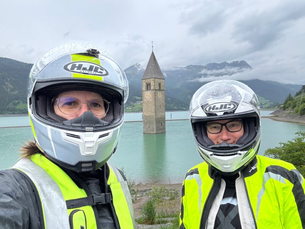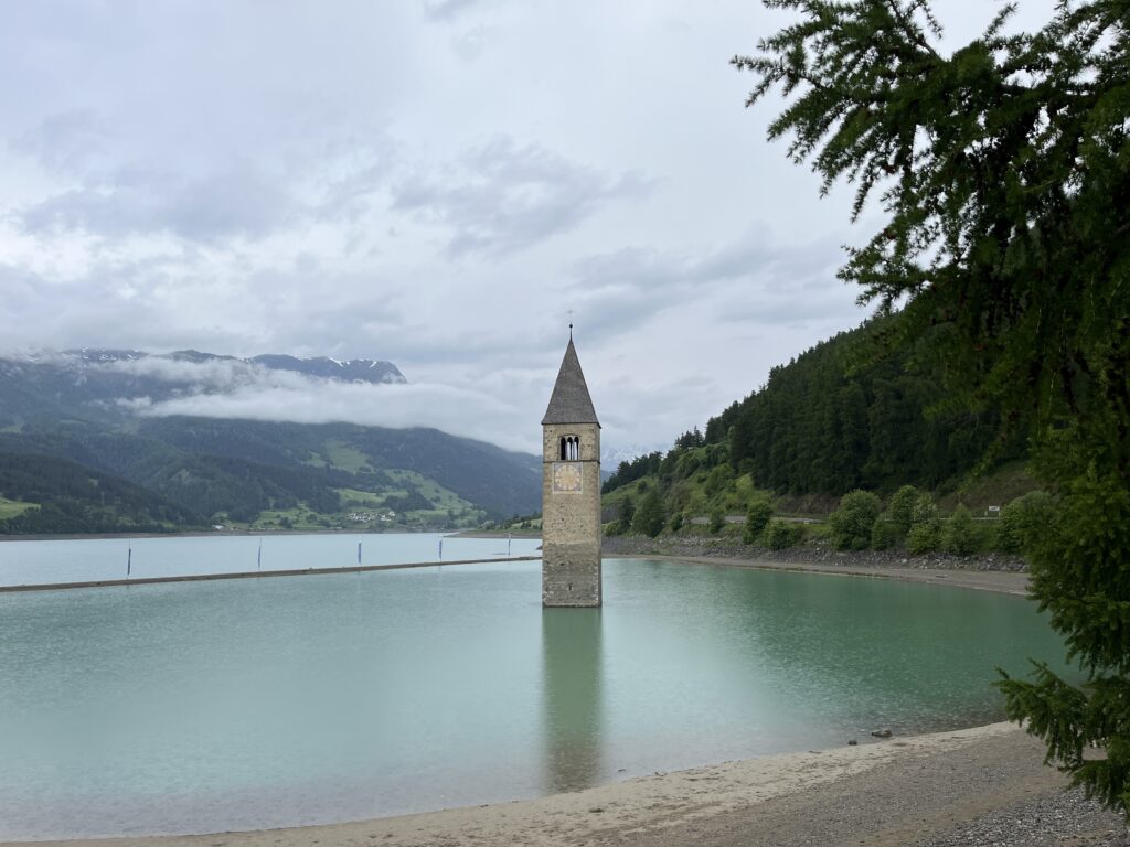 Mit dem dann zu früh einsetzenden Regen machen wir uns weiter auf den Weg Richtung Süden. Zunächst im Kolonnenverkehr am Reschensee vorbei und über den Reschenpass. Der Reschensee entstand 1950 durch Aufstauung des alten Reschensee und des Mittersee: ein lange anvisiertes und immer wieder durch verschiedene Umstände umgeplantes Projekt, das zur Umsiedlung von 100 Familien und zur Aufgabe von 70% der ursprünglich hier ansässigen Braunviehhaltung führte. Die Dörfer Alt-Graun und Reschen wurden abgetragen und geflutet. Nur noch der denkmalgeschützte Kirchturm von Graun aus dem 15. Jahrhundert ragt aus dem Wasser. Bei Niedrigwasser sind auch noch einige Keller von Graun sichtbar.