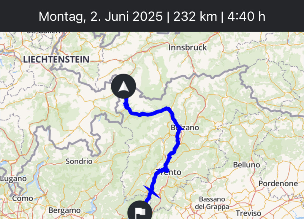 Es geht weiter im gleichen Trott bis zum Nordende des Gardasees. Nicht im gleichen Trott sind allerdings viele Roller- und Motorradfahrer entlang unserer Strecke unterwegs. Während wir brav die durchgezogene Linie achten und kein Kolonnenreiten veranstalten, überholen unsere „Kollegen“ riskant und flott an allen möglichen Stellen. Highlight: ein Harley-Fahrer, der sich verschätzt und dann halt einfach links von einer Verkehrsinsel den Überholvorgang auf der Gegenspur durchzieht… mit Sozia… in Sandalen und kurzer Hose selbstverständlich… Italians are built different.