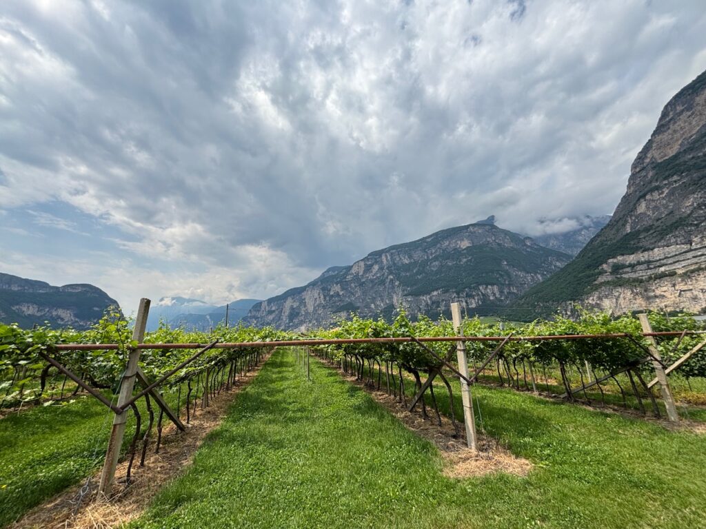 Durch Schluderns, Laars, Naturns und Partschins geht es gut ausgebaut nach Meran. Vom Reschenpass kommend sieht man bereits in der Talebene die zahlreichen Obstplantagen. Es hört ab Meran auf zu nieseln. Jippie! Dann geht es weiter auf der SS38 Richtung Bozen. Kurz vor Bozen wechseln wir auf die Südtiroler Weinstraße. Wir passieren die Weinbaugebiete am Kalterer See und um Tramin und nehmen die Route durch die Obstplantagen – unspektakulär, aber mit schöner Aussicht auf die Berge.