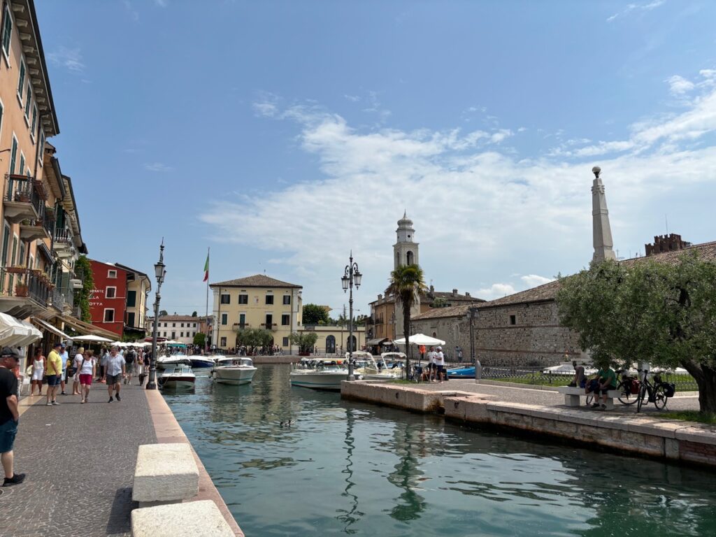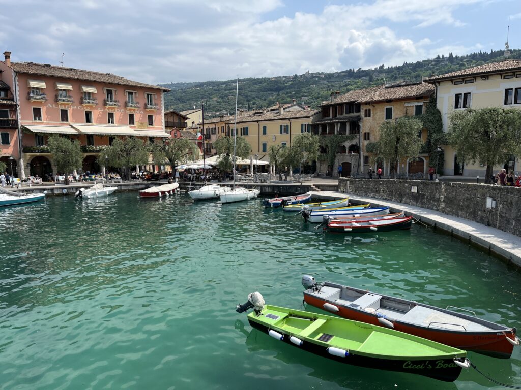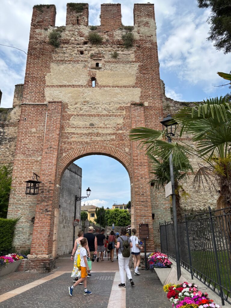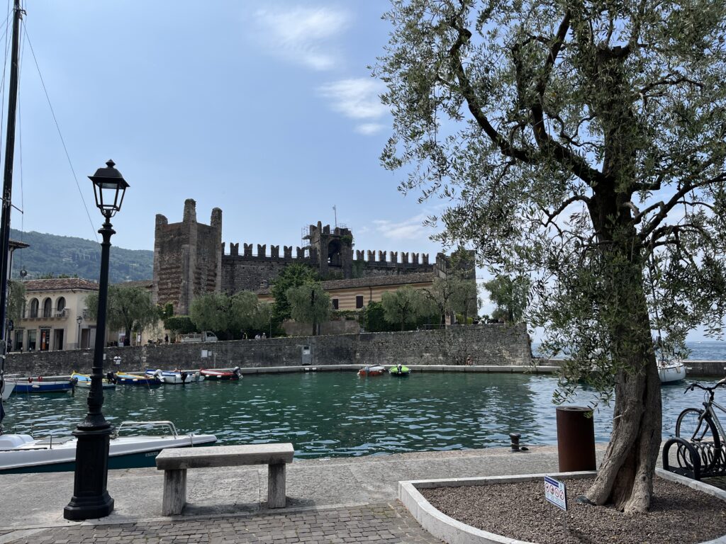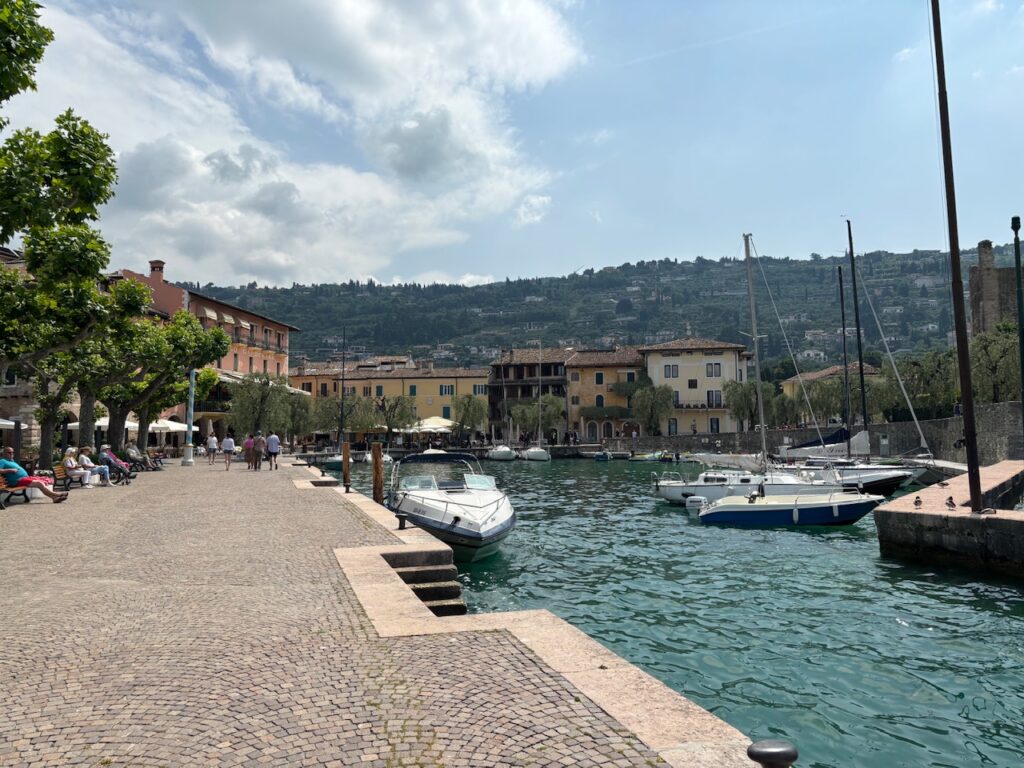 Versehentlich halten wir in Bardolino… Fehler aber schnell bemerkt und es wird weiter geritten im Stop-and-go nach Lazise mit seiner alten Stadtmauer. Hier peilen wir typisch deutsch einen offiziellen Parkplatz an und werden direkt vom Parkplatzwächter „angeschrien“, dass das kein Moto Parkplatz sei. SB ist bereits jetzt endgenervt von den Kamikaze Überholaktionen links (Roller) und rechts (Radfahrer) und dem italienischen Geschreie. In Südtirol ist es noch nett, aber hier vermissen wir etwas Herzlichkeit (außer in unserem Hotel). Der Gardasee ist darüber hinaus anscheinend fest in deutscher Hand und überlaufen. Wir werden also vom Parkplatz begleitet mit Hinweis auf den nächsten Moto Parkplatz. Dort parken wir, verstauen alles Überflüssige und ziehen Richtung Centro.
