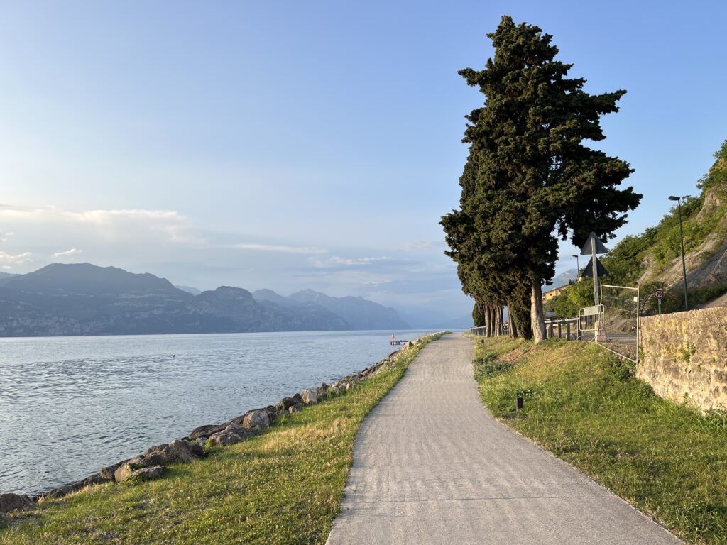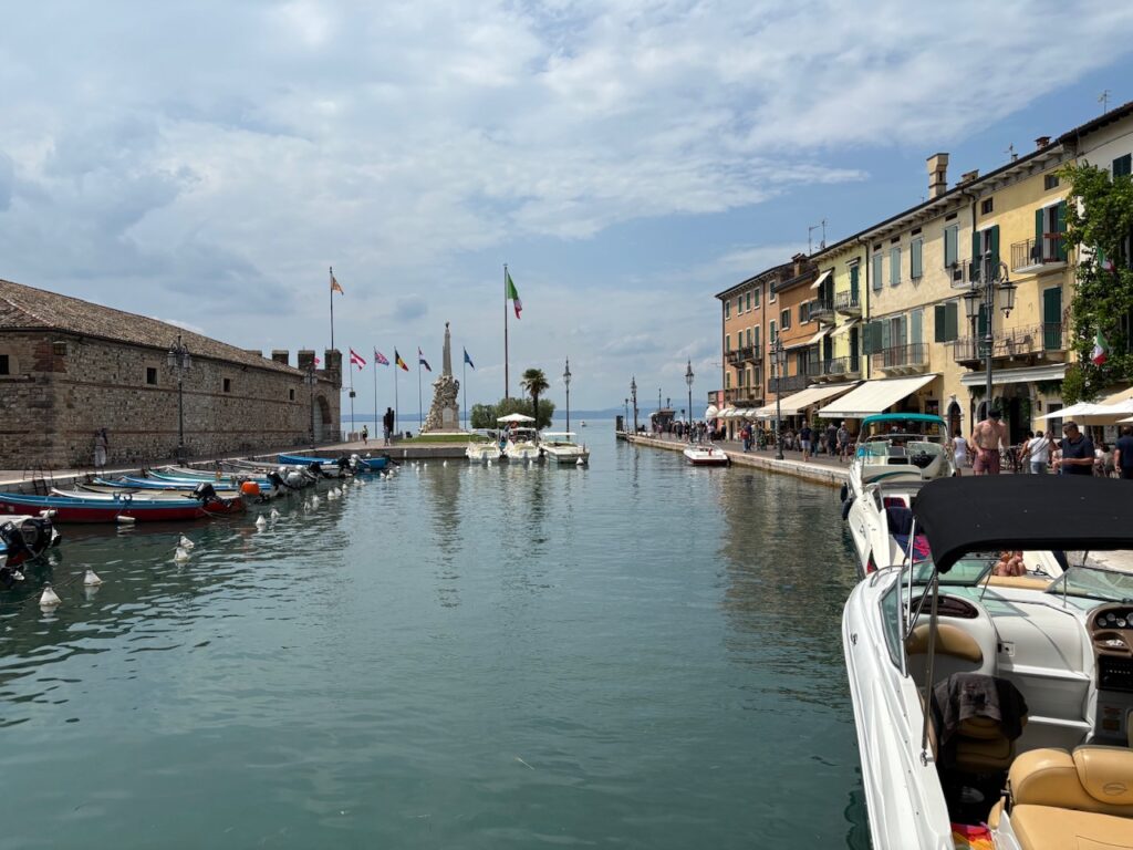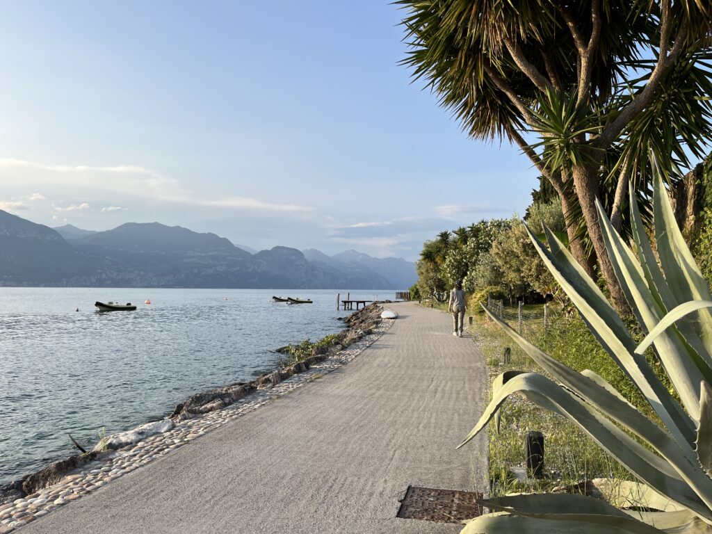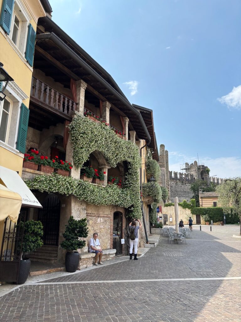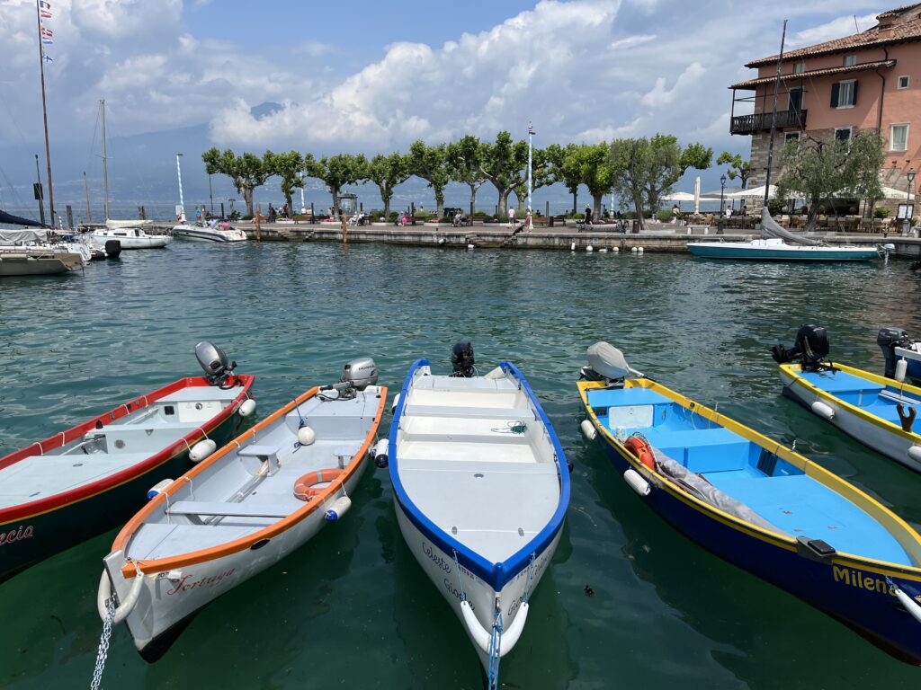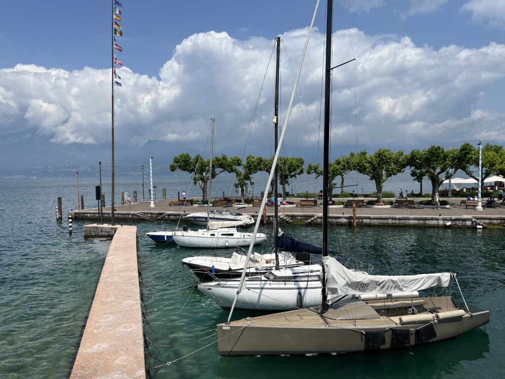 Versehentlich halten wir in Bardolino… Fehler aber schnell bemerkt und es wird weiter geritten im Stop-and-go nach Lazise mit seiner alten Stadtmauer. Hier peilen wir typisch deutsch einen offiziellen Parkplatz an und werden direkt vom Parkplatzwächter „angeschrien“, dass das kein Moto Parkplatz sei. SB ist bereits jetzt endgenervt von den Kamikaze Überholaktionen links (Roller) und rechts (Radfahrer) und dem italienischen Geschreie. In Südtirol ist es noch nett, aber hier vermissen wir etwas Herzlichkeit (außer in unserem Hotel). Der Gardasee ist darüber hinaus anscheinend fest in deutscher Hand und überlaufen. Wir werden also vom Parkplatz begleitet mit Hinweis auf den nächsten Moto Parkplatz. Dort parken wir, verstauen alles Überflüssige und ziehen Richtung Centro.