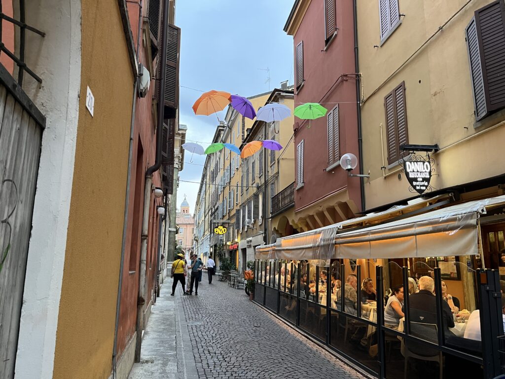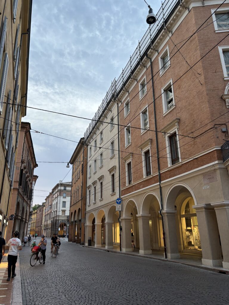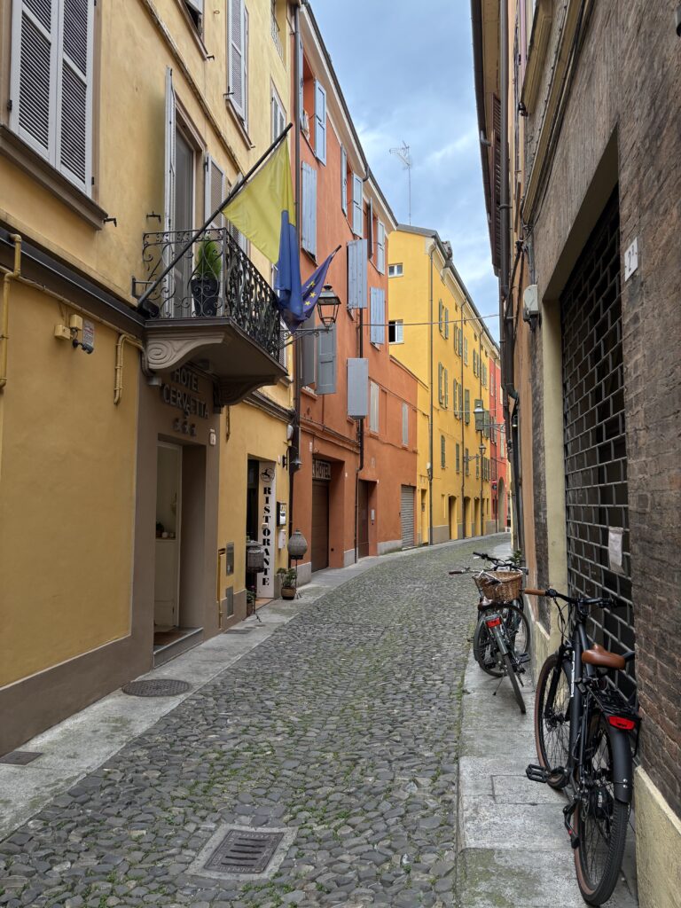 Wir fahren direkt in die Altstadt von Modena, denn das darf man, wenn man ein Hotel in der Altstadt gebucht hat. In der kleinen Hotelgarage sind auch unsere Mopeds für die Nacht sicher untergebracht.