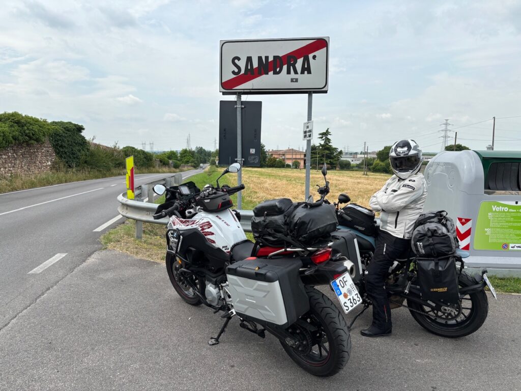 Das eigentliche Elend beginnt aber dann direkt hinter Garda. Wir biegen ab, weg vom See und finden uns ab da in einer flachen Agrarlandschaft wieder. Eine „Strada dei vini e dei sapori“ macht Hoffnung auf eine nette Fahrerei, aber wir haben uns bei der Route echt vergriffen. Es ist stures Getuckere im dichten Verkehr entlang geodelter Felder. Auch SL ist zunehmend genervt von Hitze, Verkehr und Fahrt durch 100km „Gewerbegebiet“ = Po-Ebene.