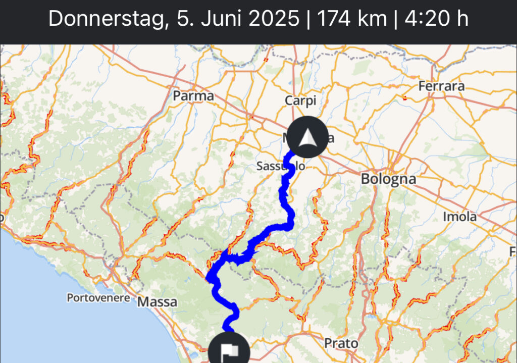 So gestärkt schwingen wir uns bei 24 Grad in den Sattel. Es geht nach Lucca. Den Weg aus der Stadt suchen wir über Formigine und Richtung Maranello. SB verfährt sich aber bereits hier schon zum ersten Mal – gut, dass wir keine Helmkommunikation haben 😬.
