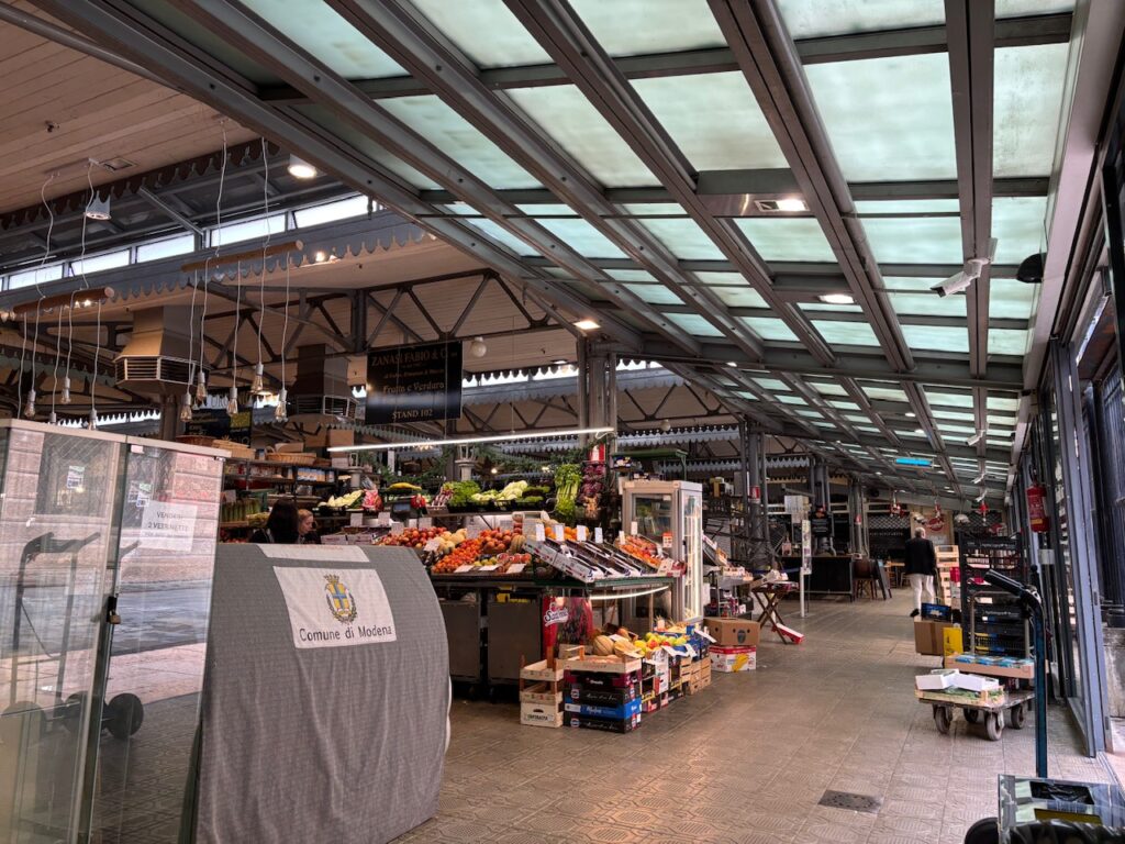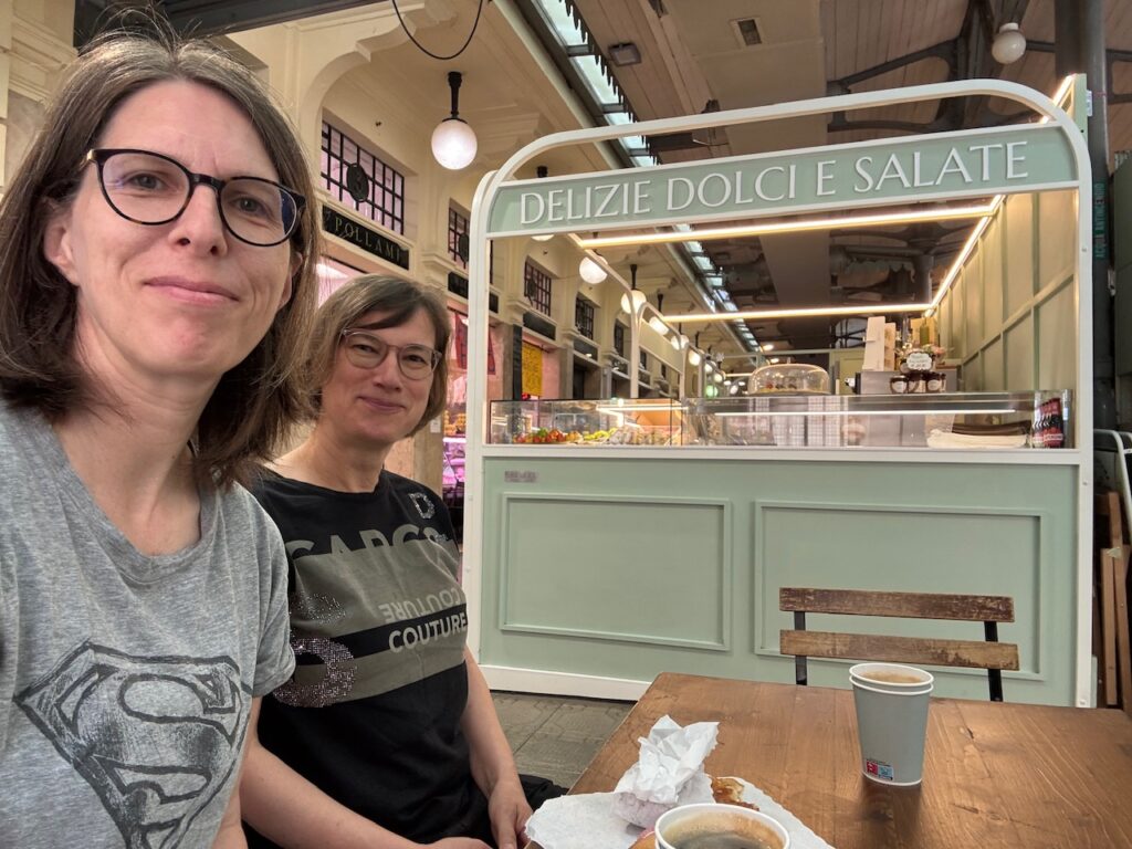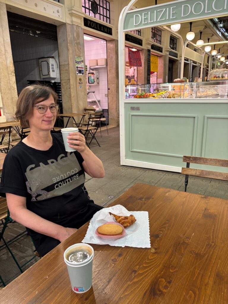 Die Markthalle Mercato Albinelli wurde uns empfohlen in Modena. Sie liegt sehr nahe an unserem Hotel und daher ziehen wir los, um dort einen Kaffee zu trinken. Es gibt reichlich Obst und Gemüse, Fisch, Fleisch, Käse und Backwaren an den Ständen zu kaufen. Eine kleine Bäckerei lacht uns an. Ein freies Tischchen gibt es auch, also Frühstücken wir italienisch: ein Americano und ein süßes Teilchen.