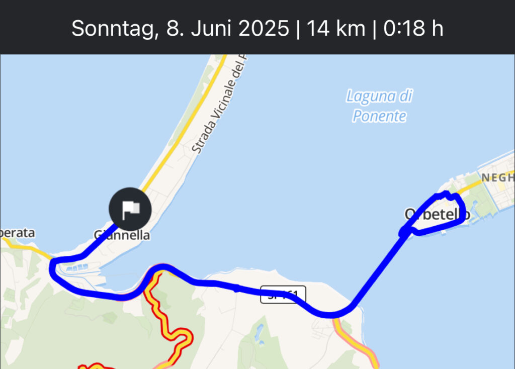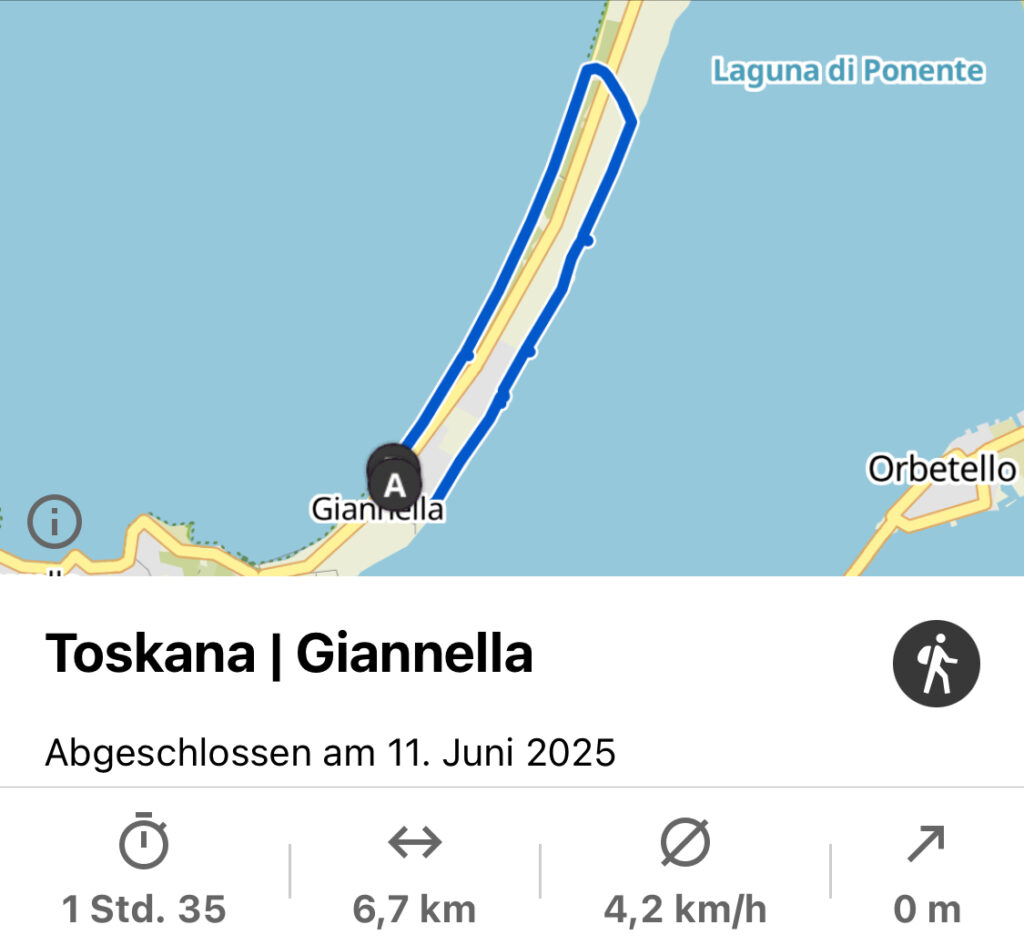 Das Nichtstun muss auch mal unterbrochen werden. Der Plan nach Albarese zu fahren (ca. 30 Minuten) und dort Fahrräder für eine Tour durch den Maremma Regional Park zu machen wird aus Faulheit verworfen. Es geht lediglich zu Fuß ein paar Kilometer die Landzunge entlang. Erst entlang der Lagune Orbetello und dann am Strand Giannella zurück.